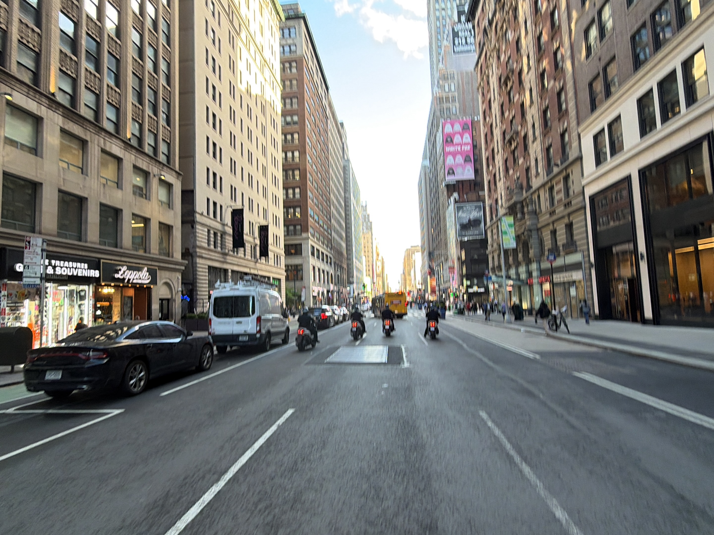 The image shows a street scene in New York City, United States, with tall buildings lining both sides of the road. The street has multiple lanes of traffic, with a black car parked on the left side an…read more