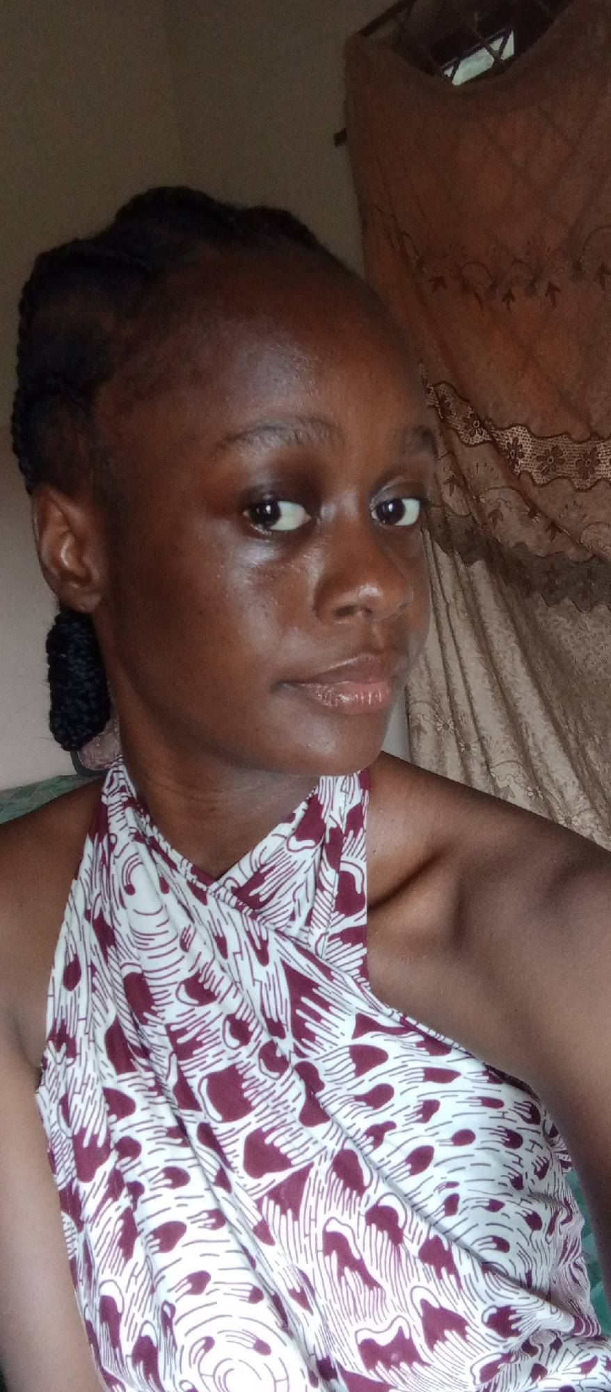 A young woman from Akwanga, Nigeria, is captured in a close-up, chest-up portrait. She has dark skin and her hair is styled in neat braids pulled back from her face, with a bun or coil visible behind…read more