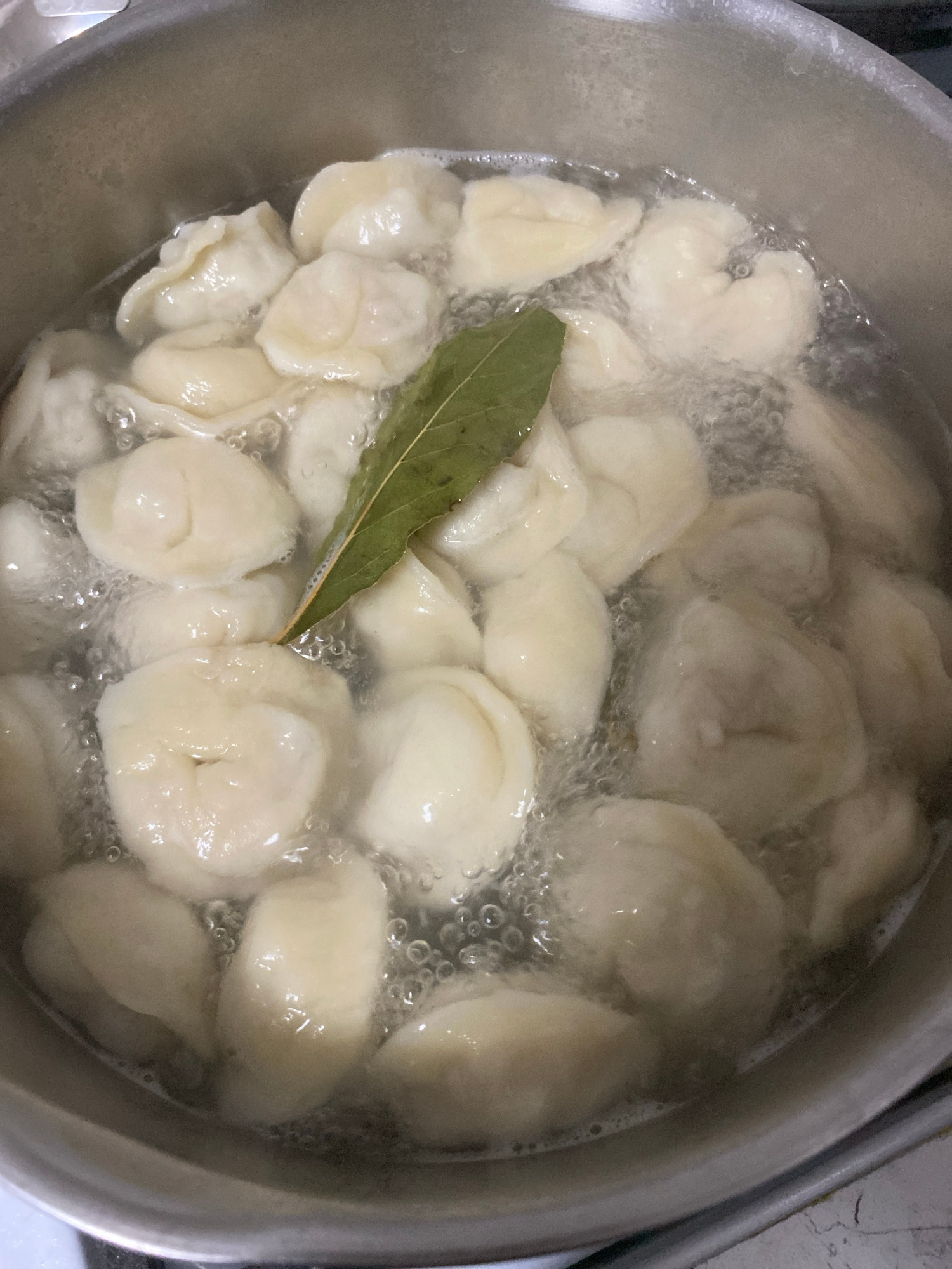 A top-down shot shows a silver pot filled with dumplings boiling in water. A single bay leaf is also in the pot. The dumplings are various sizes and shapes. Bubbles surround the dumplings, indicating…read more