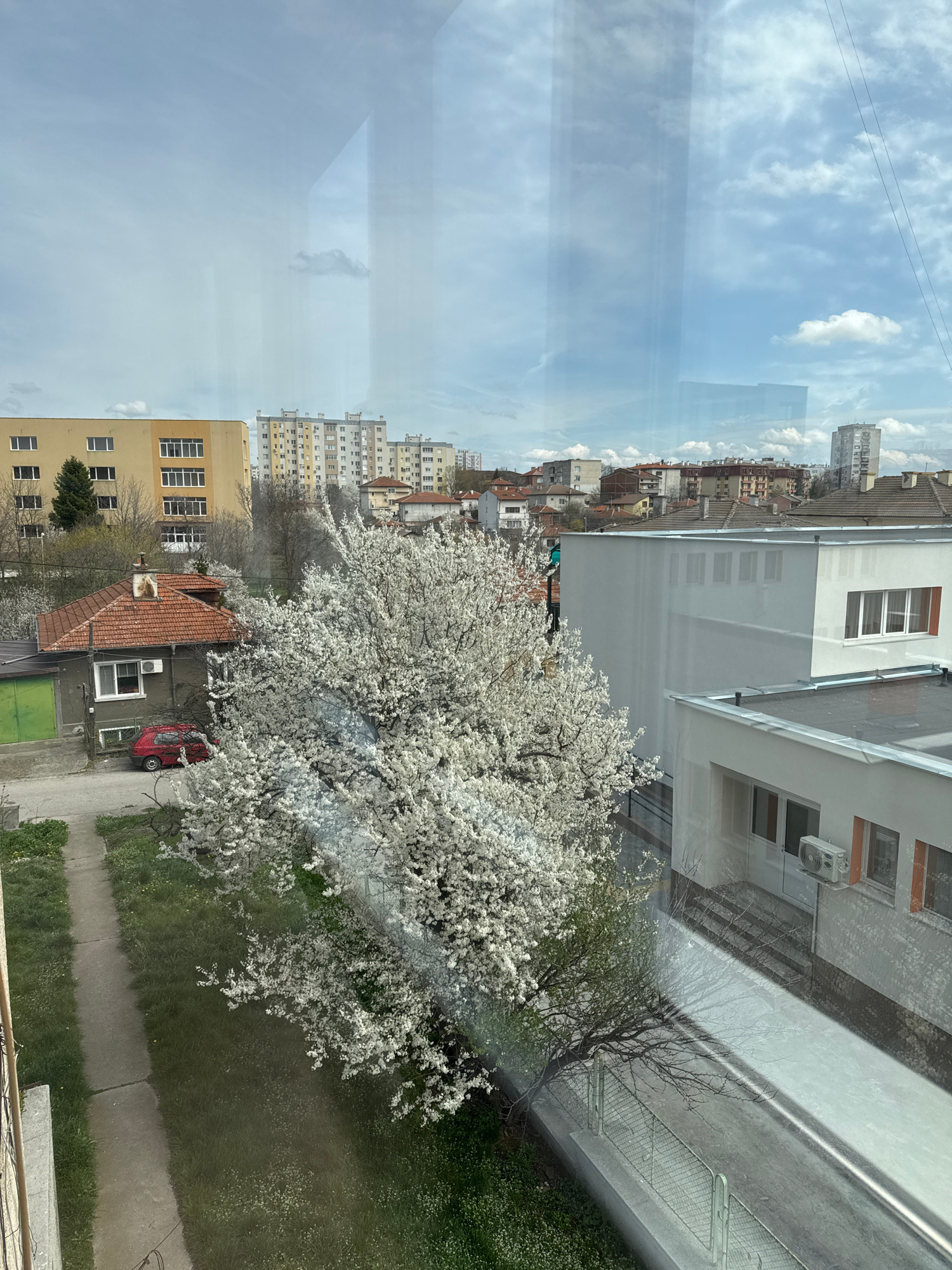 The photograph is taken from an elevated position, possibly inside a building, looking out through a window in Haskovo, Bulgaria. The window reflects the sky, with clouds visible. Outside the window,…read more