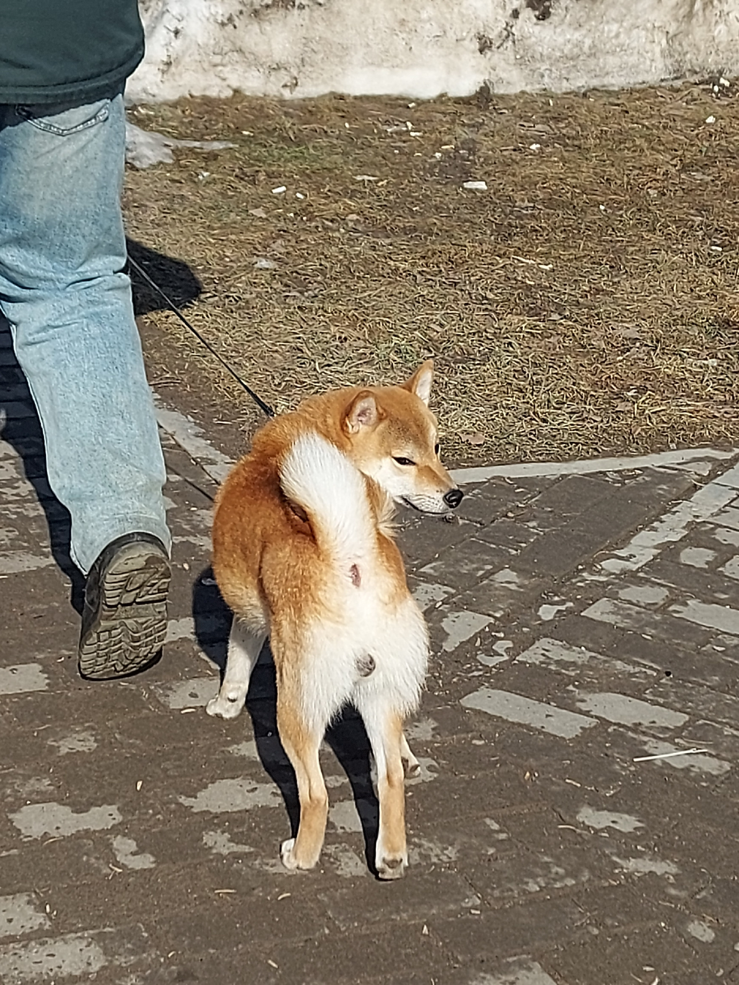 The image depicts an outdoor scene in the city of Chaikovsky, Russia, on a bright, sunny day. The lower left leg of an individual, clad in light blue jeans and a dark, rugged walking boot, is visible…read more