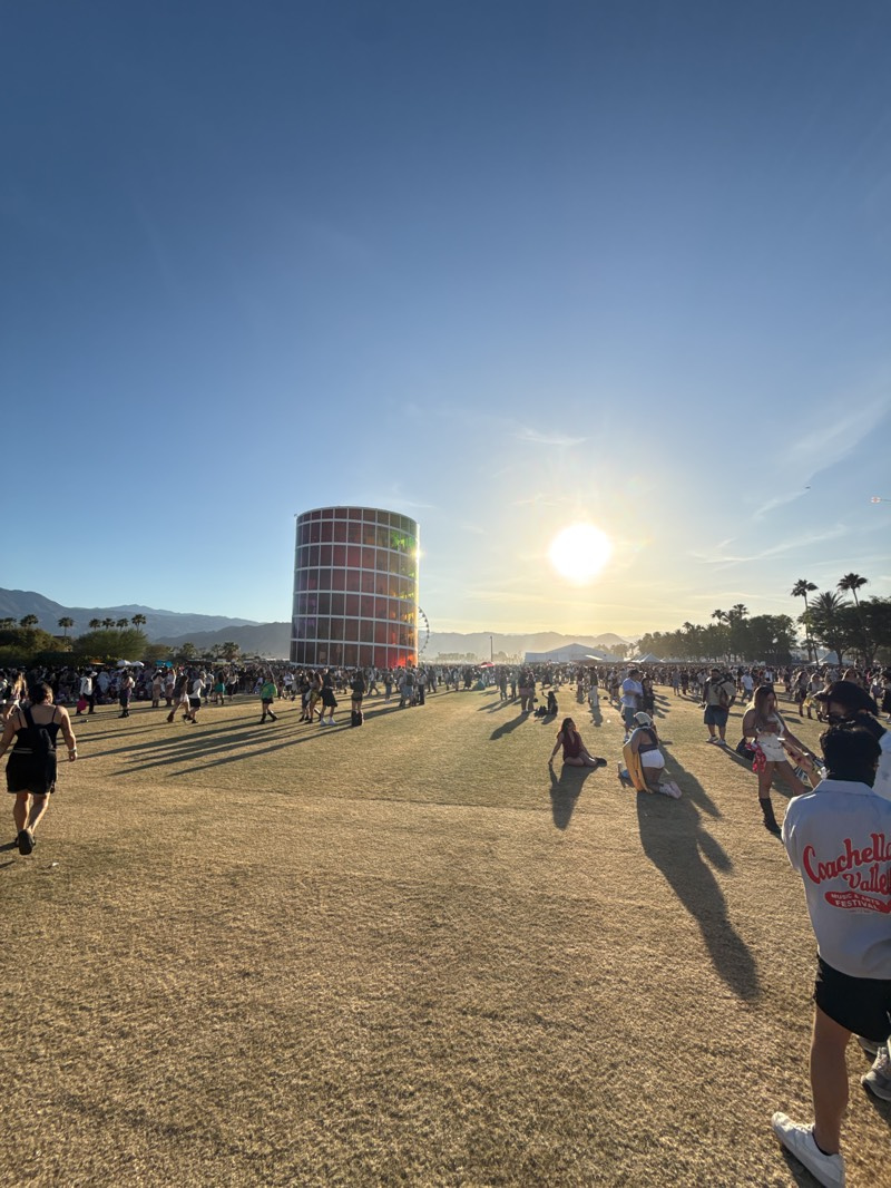 The image depicts a sunny, outdoor scene at the Coachella Valley Music and Arts Festival, located in Indio, United States. A large crowd of people is dispersed across a grassy field, with a cylindrica…read more