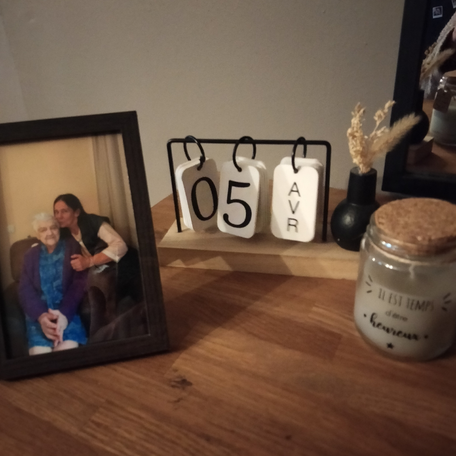 A photograph shows a wooden desk or tabletop. On the left, there is a framed photograph of an older woman seated with a younger woman embracing her. Center in the frame sits a perpetual calendar displ…read more
