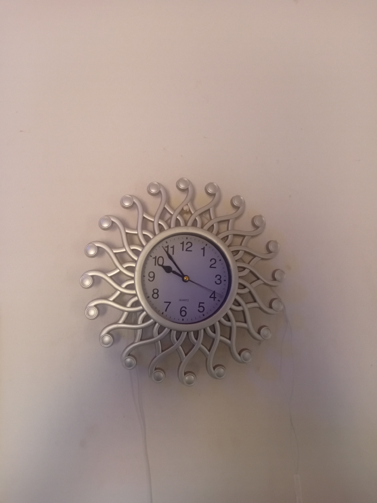 A medium shot shows a silver decorative clock hanging on an off-white wall. The clock has a circular face with a silver bezel and black numbers. The hands on the clock show approximately 7:07. The clo…read more