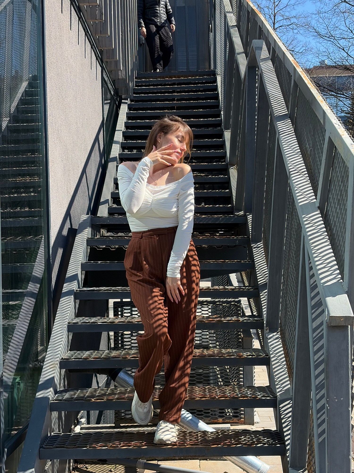A woman in a white long-sleeved shirt and brown pants leans over a black metal railing. She is fair-skinned with brown hair and has her hand near her face. Another person is lying down on a grey walkw…read more