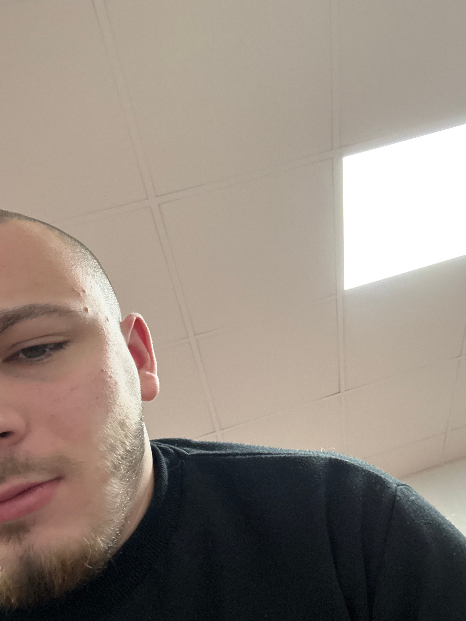 The image shows a low-angle, close-up view of a person's face, tilted upwards. The person has light skin, short hair, and a beard. An ear is visible near the top of the frame. The person is wearing a…read more