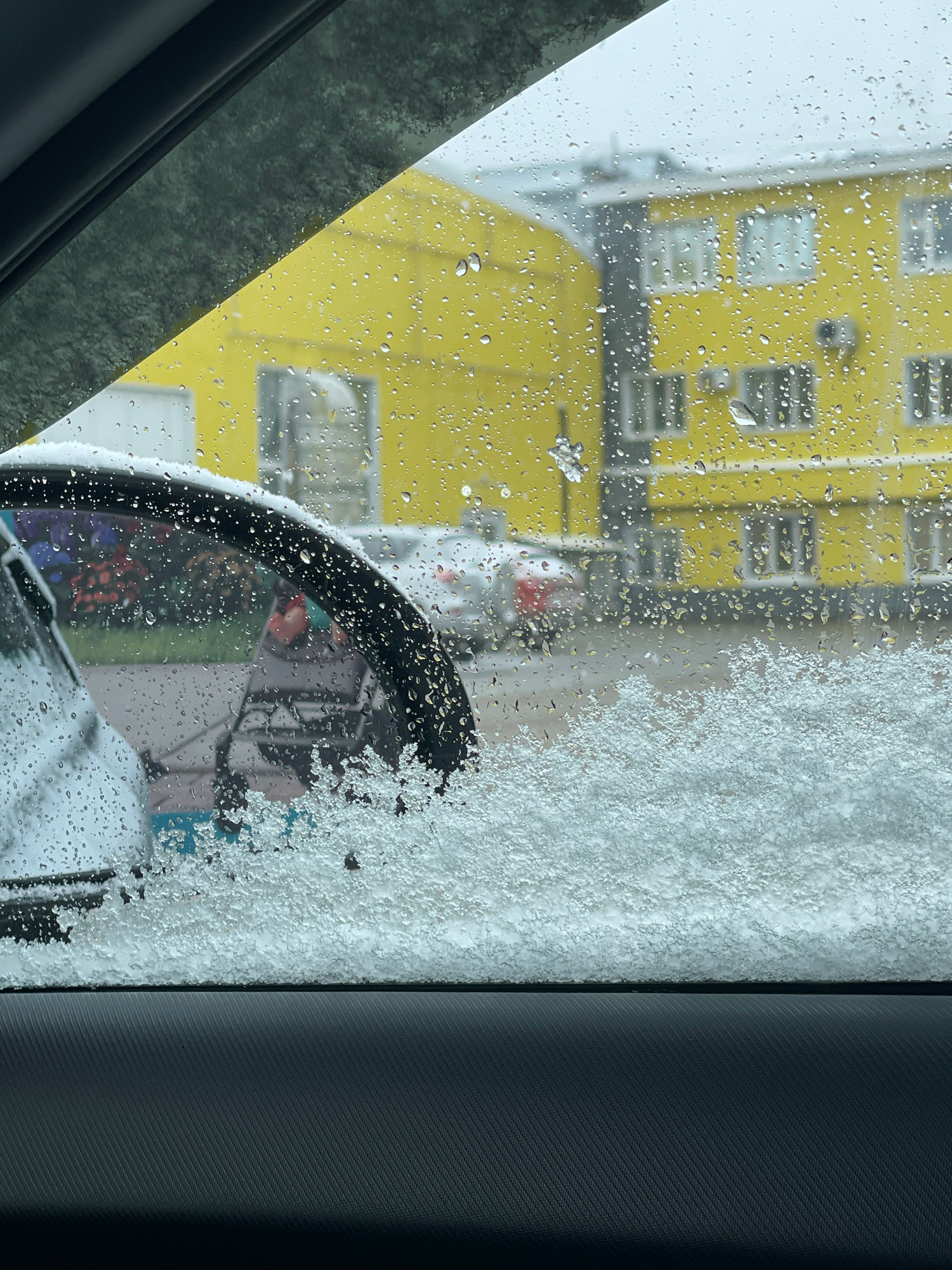 The image is taken from inside a vehicle, looking out at a snow and rain-covered window. A yellow building is visible in the background. The vehicle's side mirror is partially visible. Snow and water…read more