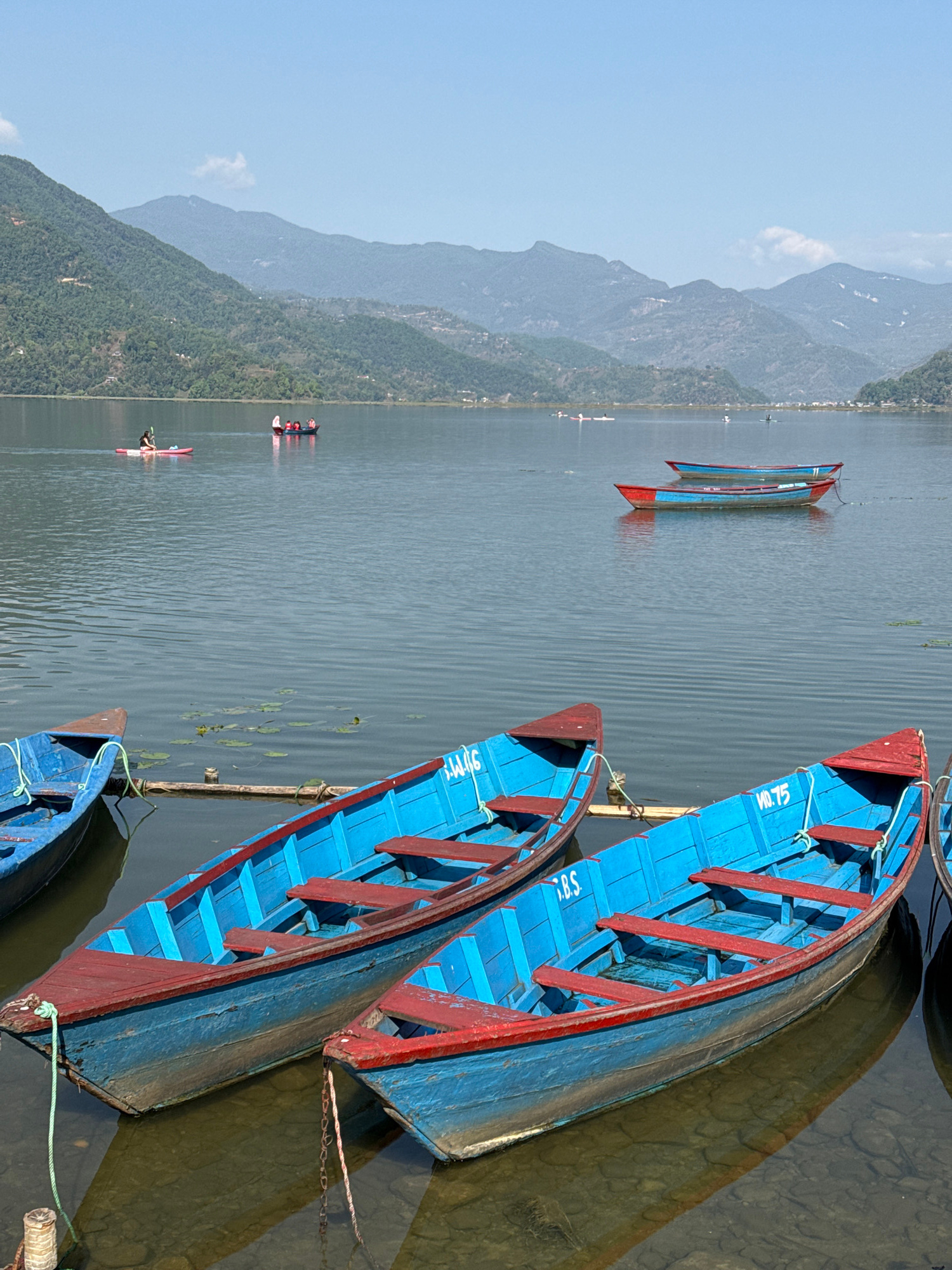 The image depicts a serene lake scene in Pokhara, Nepal. Several vibrant blue and red wooden boats are docked near the shore. In the distance, mountains rise against a clear sky. On the water, a few p…read more