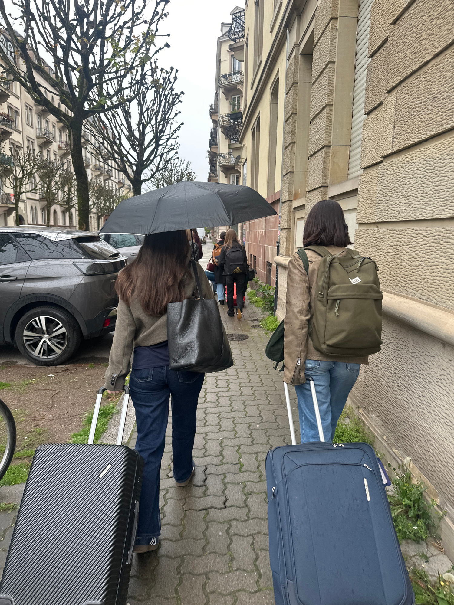 Two individuals are seen walking on a brick-paved sidewalk alongside a street in Strasbourg, France, on a rainy day. The first individual has dark hair, a light brown jacket, blue jeans, and an olive-…read more