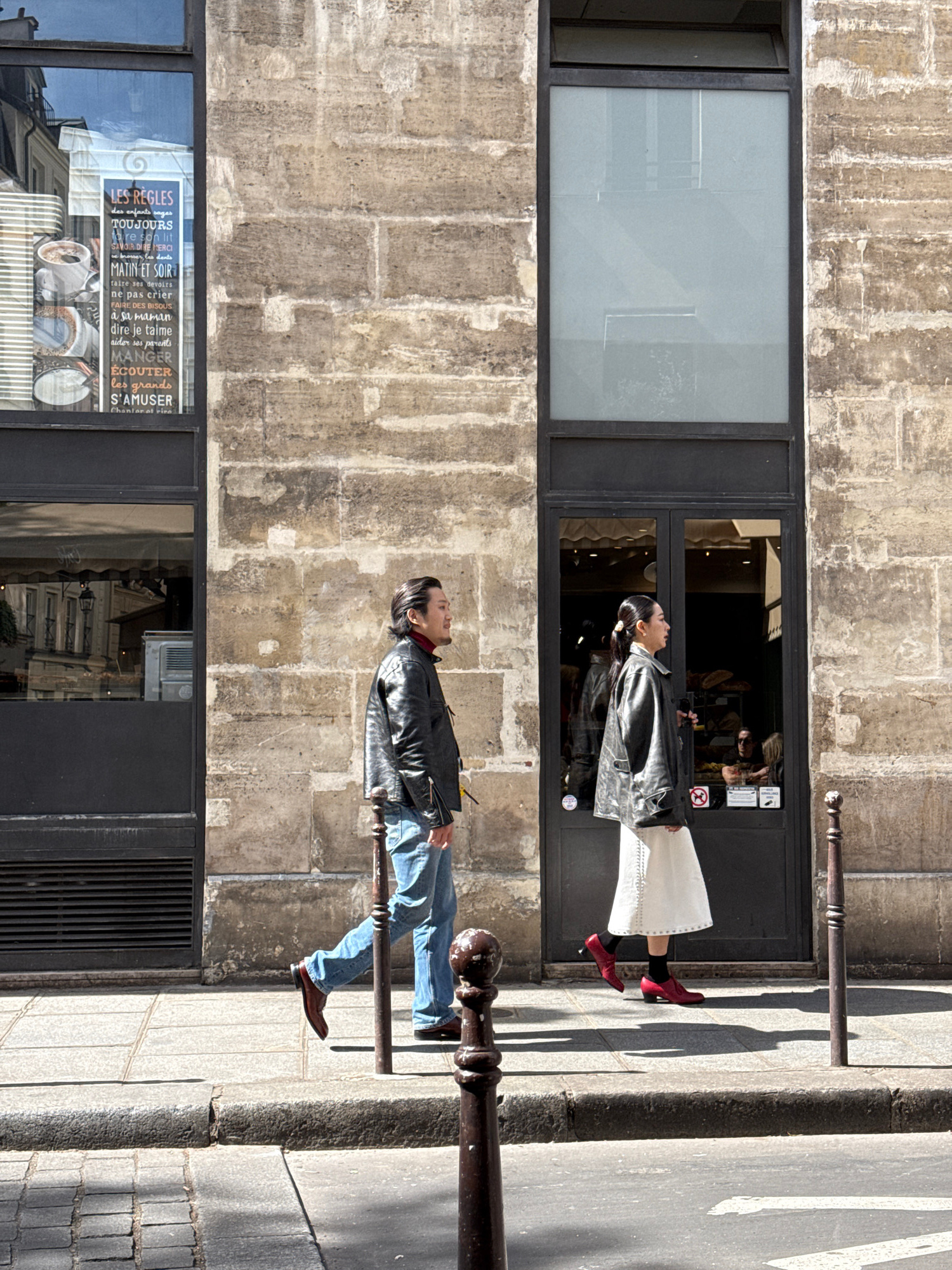 The image depicts a street scene in Paris, France. A man in a black leather jacket and jeans sits on a metal railing in front of a building with stone walls. A woman in a similar jacket, white skirt,…read more