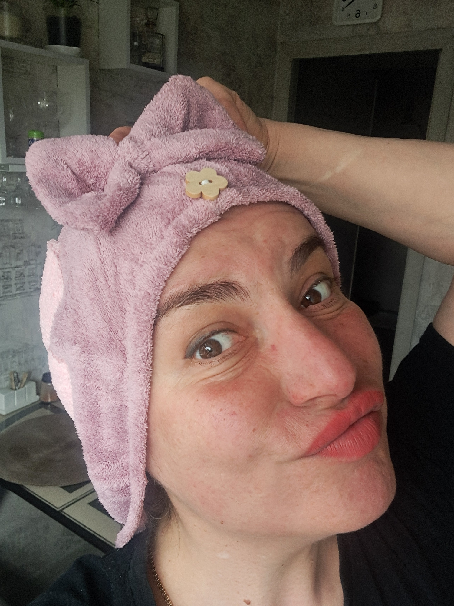 A close-up, slightly rotated image depicts a woman with a pink towel wrapped around her head, adorned with a light-colored flower-shaped ornament. She has reddish skin, brown eyes, and red lipstick. T…read more