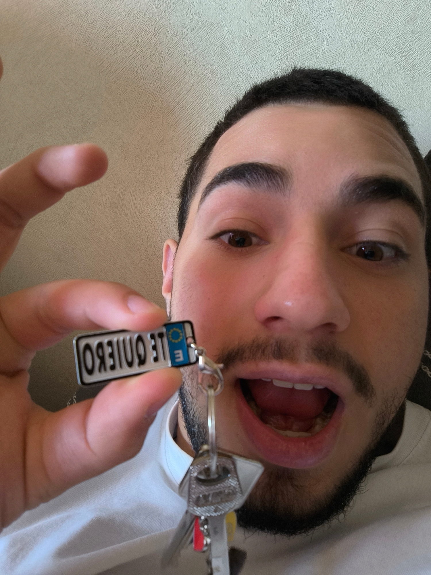 A close-up selfie captures a young man with dark hair, prominent eyebrows, a mustache, and a short beard, displaying a surprised or excited expression with wide-open eyes and mouth. His right hand, po…read more