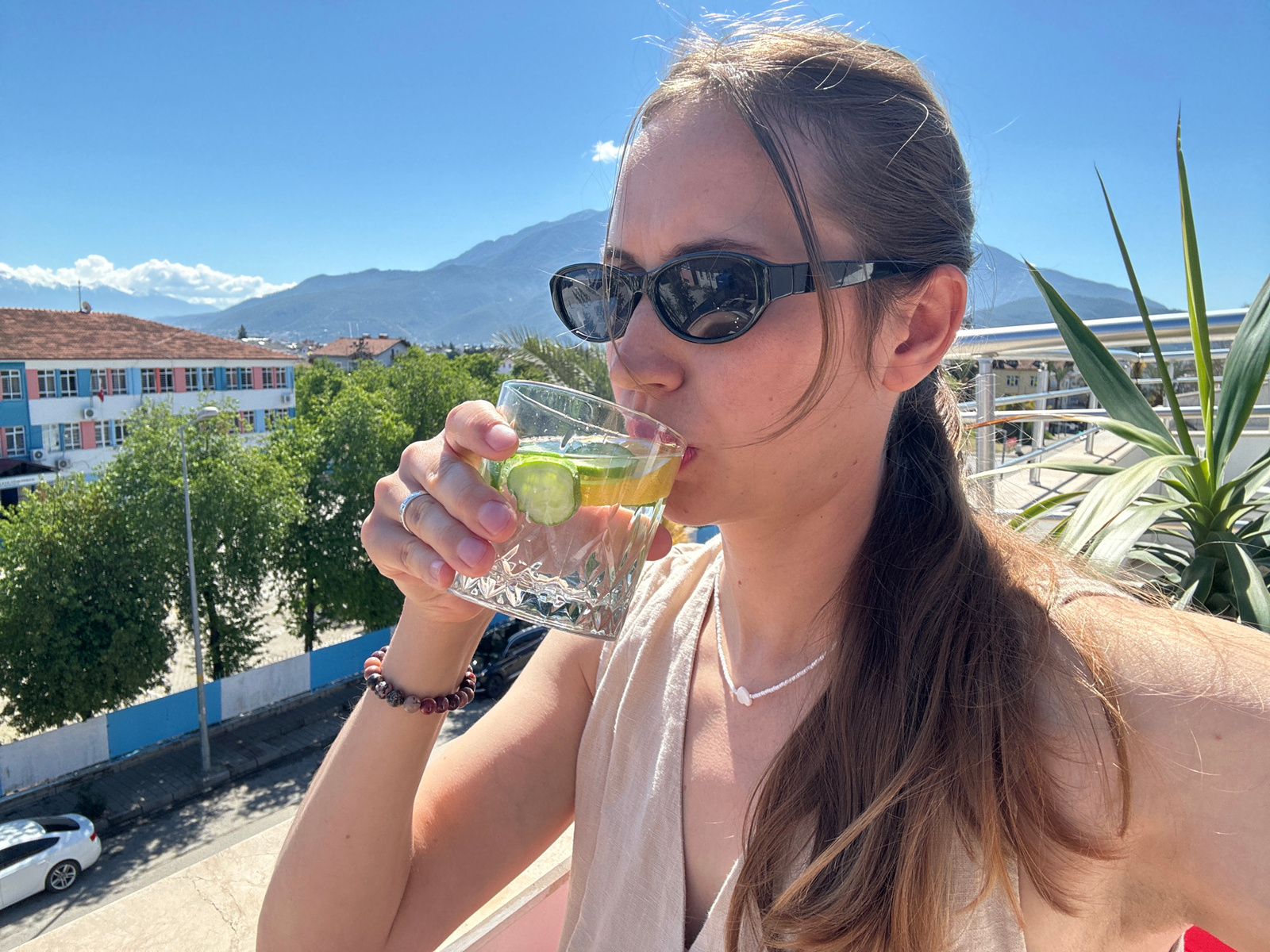 An individual, appearing female, is depicted outdoors on a clear, sunny day, positioned on a balcony. The person is shown in profile, facing right, actively drinking from a clear, faceted glass contai…read more