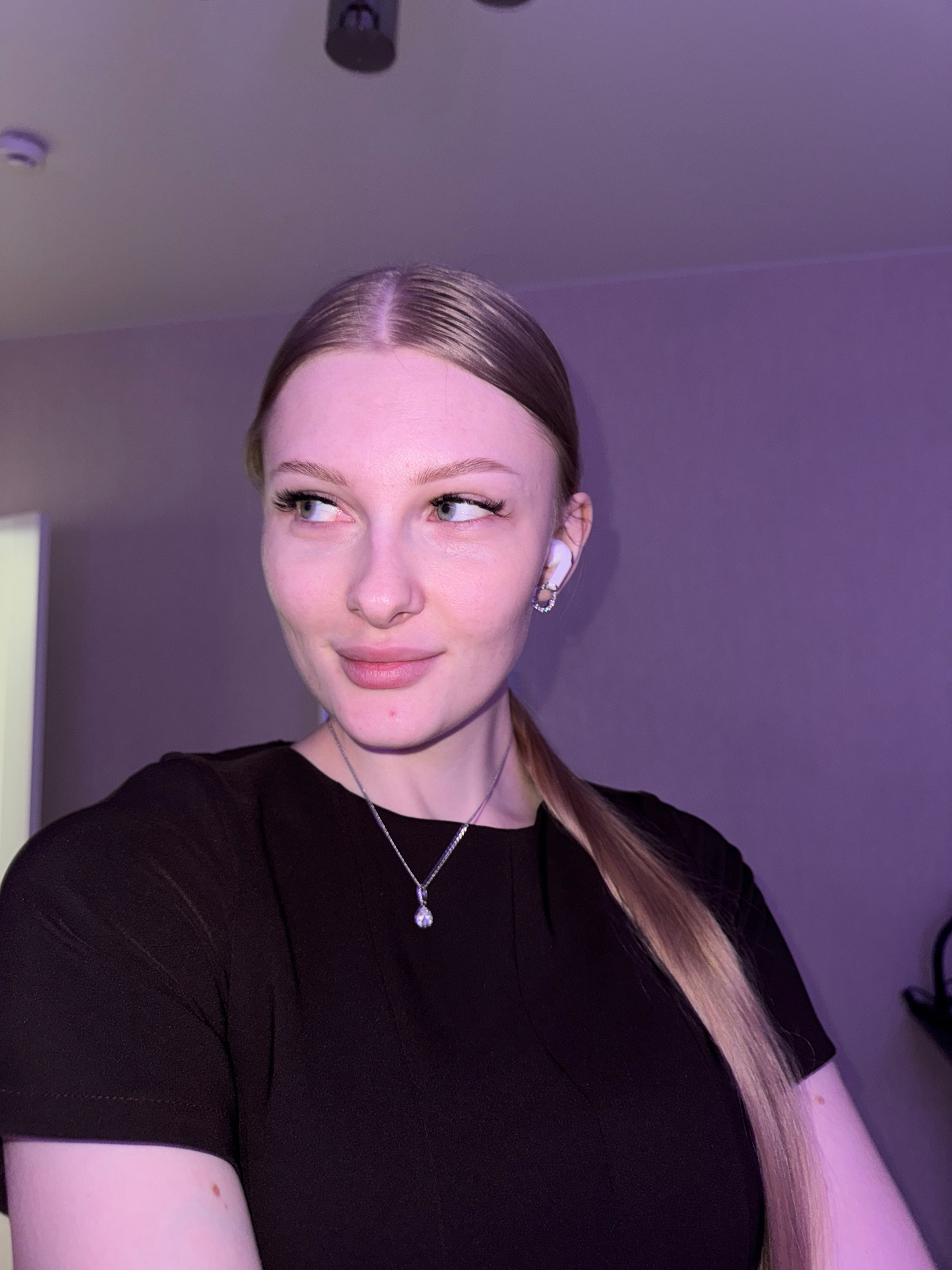 A young fair-skinned woman with blonde hair pulled back is depicted indoors. She is wearing a black top and a silver necklace. Her gaze is directed towards the viewer. An earbud is visible in her ear.…read more