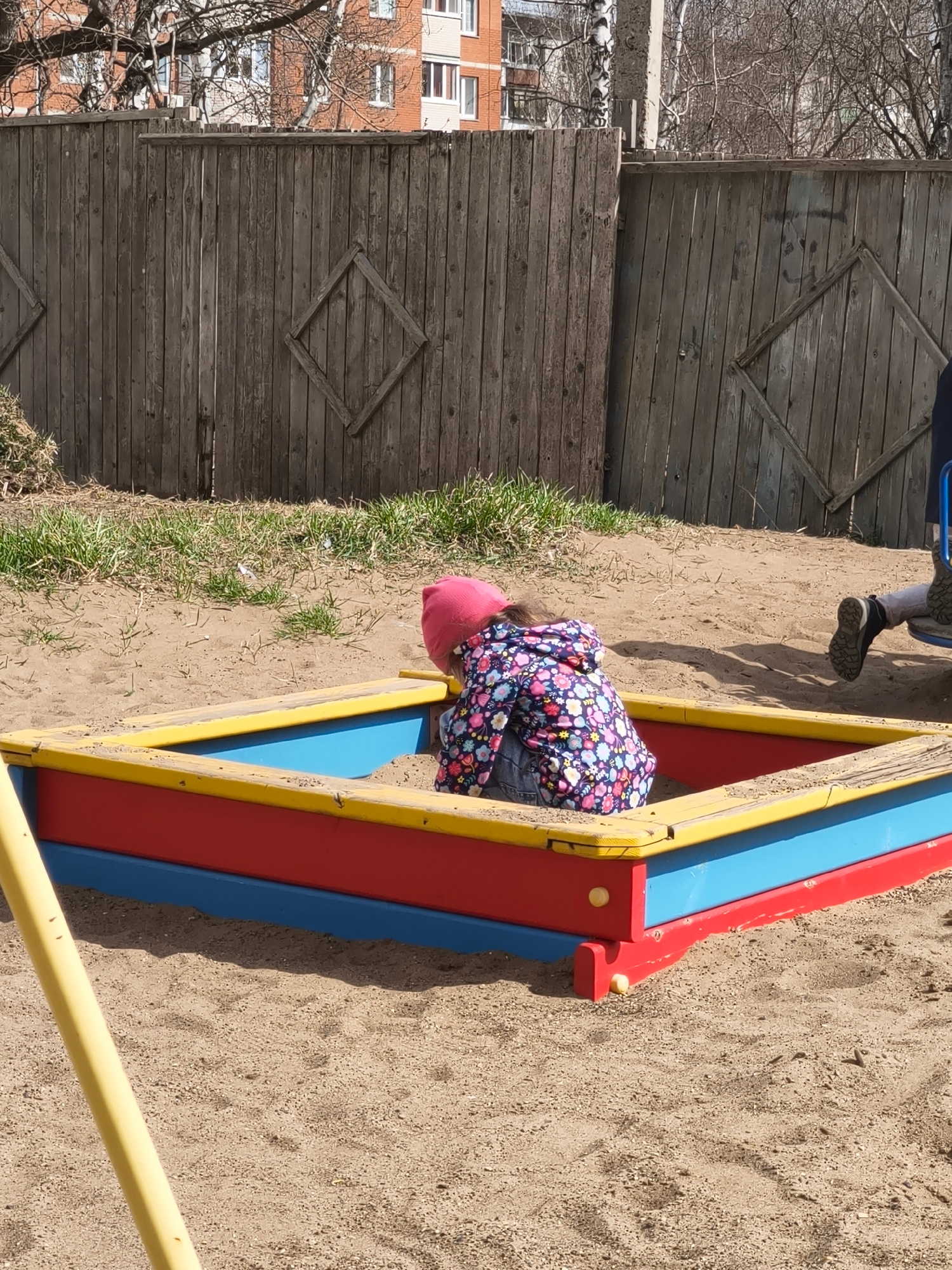 A child in a pink hat and a floral jacket is in a colorful square sandbox filled with sand. Another person, likely an adult, is visible in the background, slightly out of focus. Behind the sandbox is…read more
