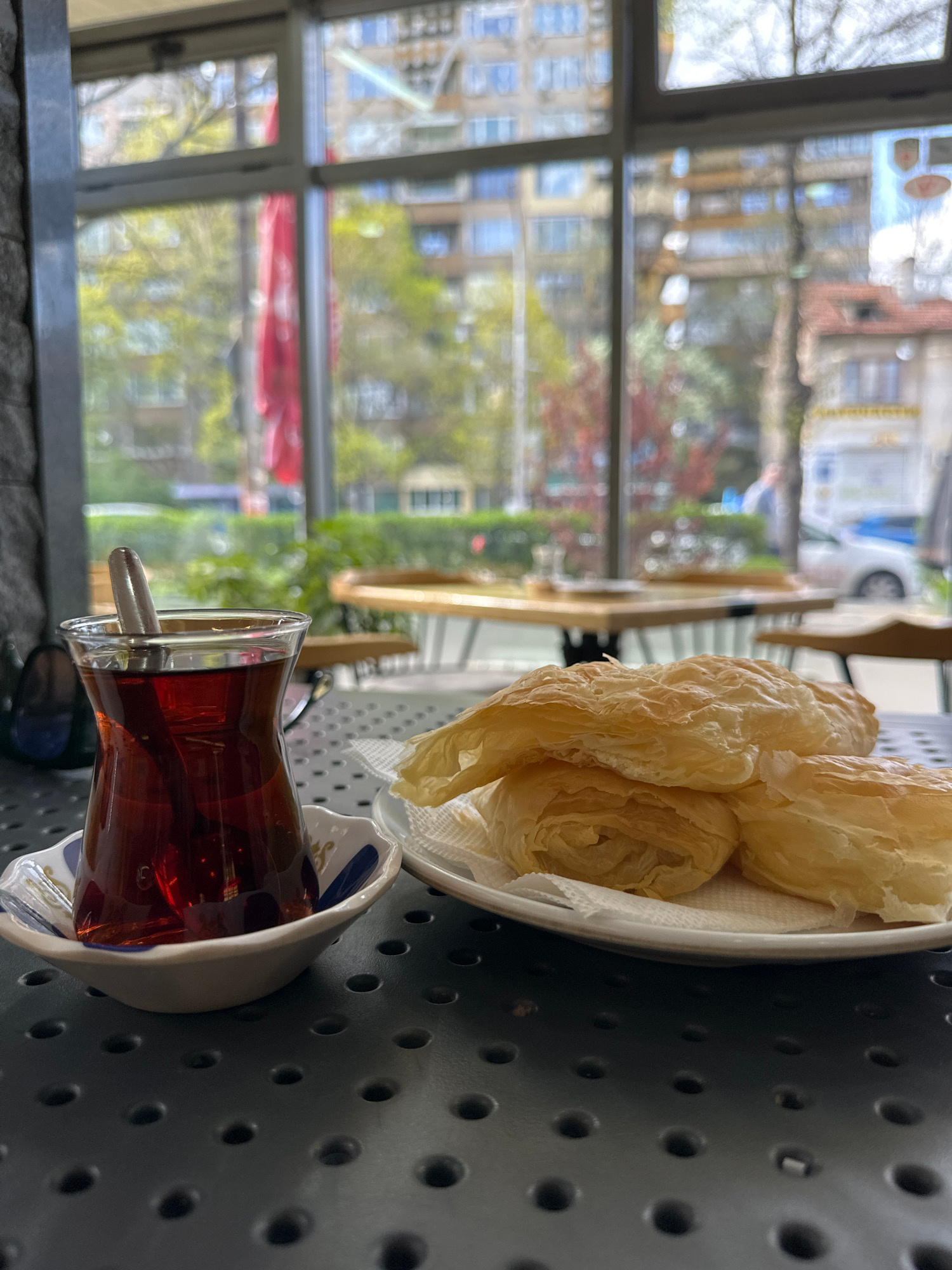 This vertical image depicts a close-up of a table setting inside what appears to be a cafe or restaurant in Sofia, Bulgaria, with an urban outdoor scene visible through a large window. The primary su…read more