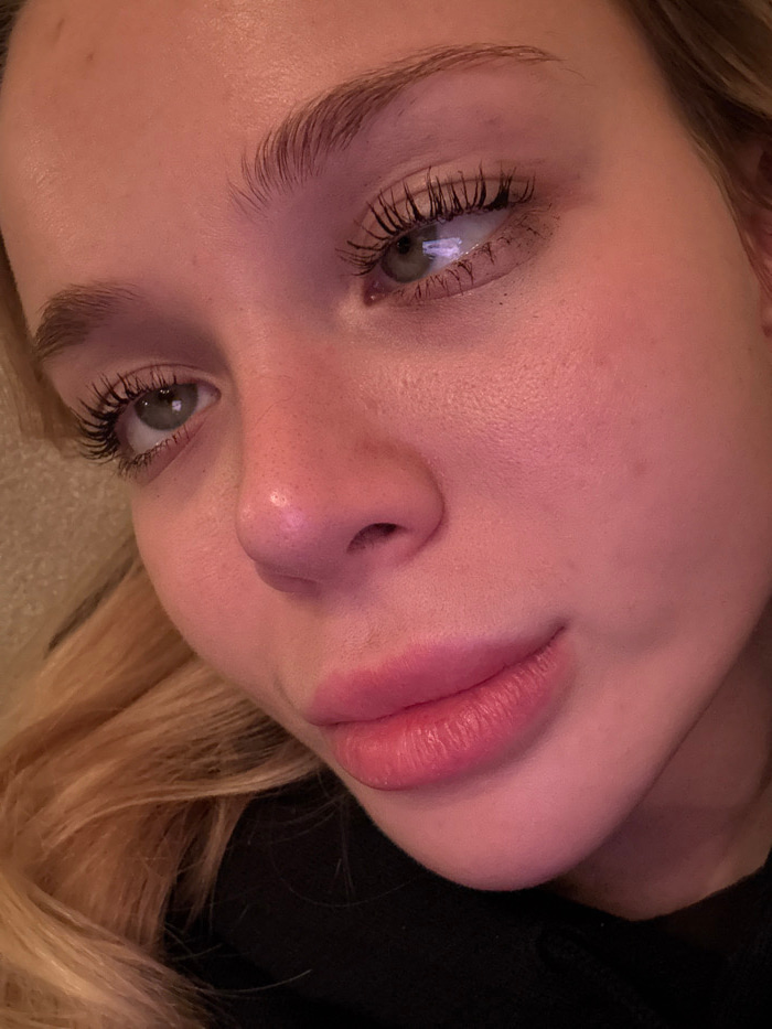 A close-up, angled portrait of a fair-skinned person with striking features. They have prominent eyelashes coated in mascara, defined eyebrows, and full lips. The skin appears smooth, possibly due to…read more