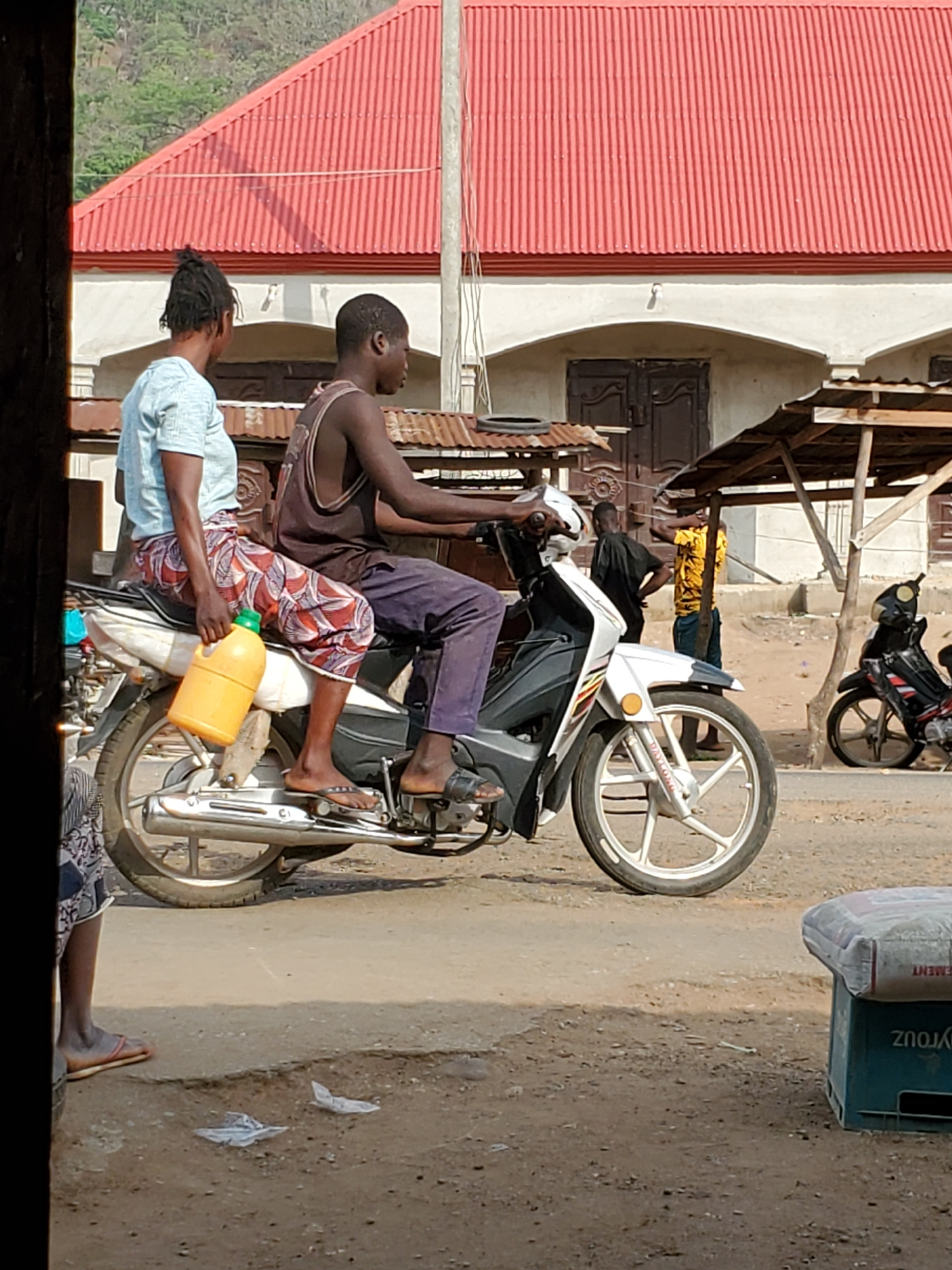 The image captures an outdoor street scene in Mararaba, Nigeria, bathed in bright midday sunlight, evident from the strong, defined shadows. The primary subjects are two men seated on a white and bla…read more