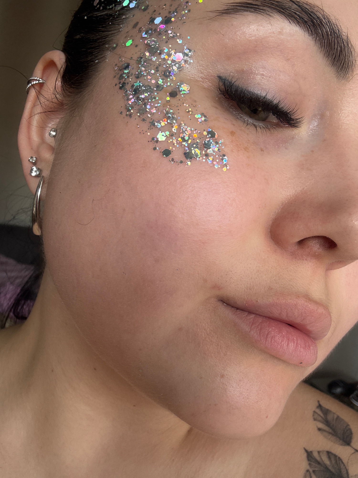 A close-up, angled portrait captures a person, likely female, from the mid-forehead to the upper chest, viewed from the right side of their face. The person appears to be lying down or reclining in a…read more