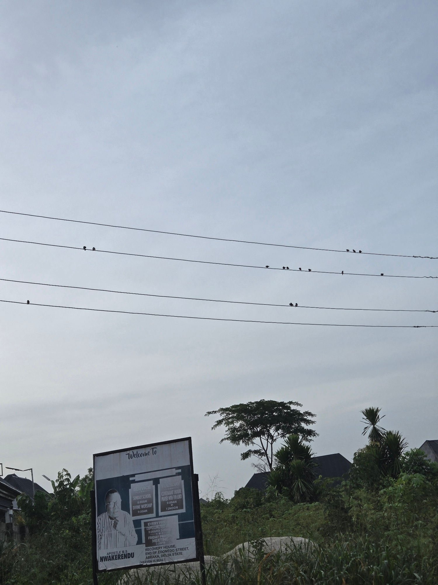The image shows a sky with birds sitting on power lines. To the right is a partially obscured billboard for Apostle M.S. Nwakerendu's church. The sign states it is located at Recovery House, End of Ed…read more