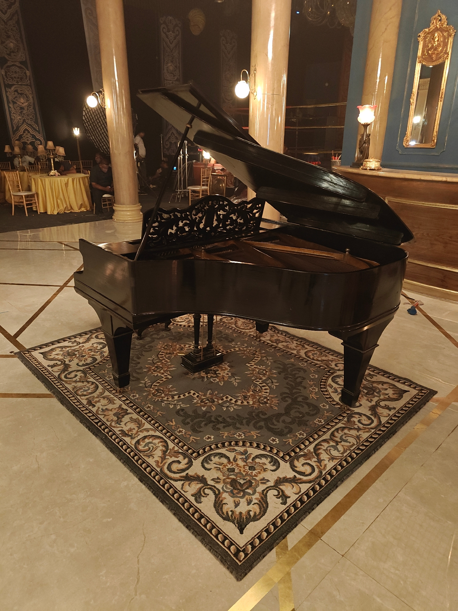 A black grand piano stands on an ornate area rug in a large room with tiled floors. The piano lid is partially open, revealing the interior. The room features large columns, a mirror in a gold frame,…read more