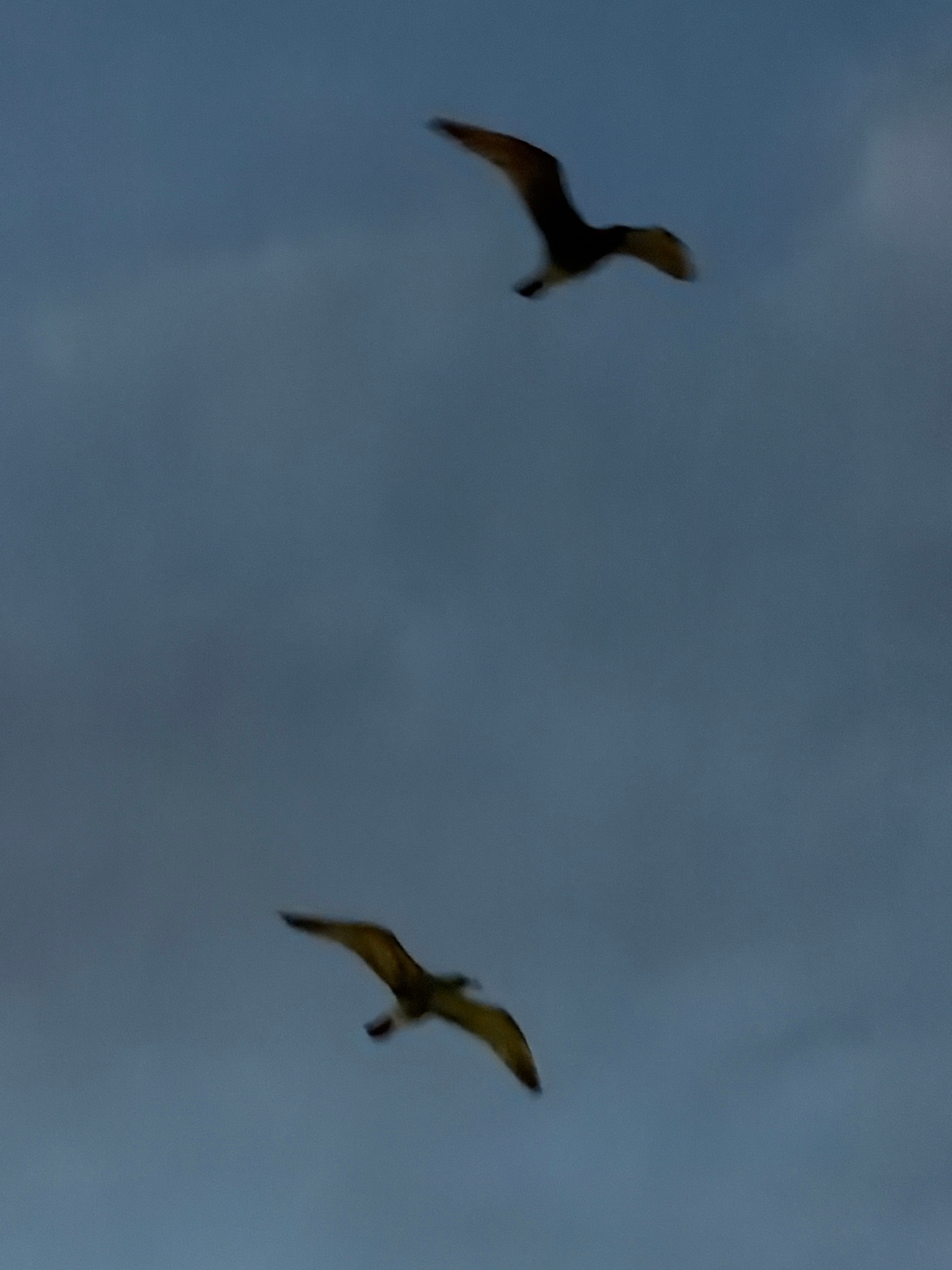 Two birds are flying in the sky. The sky is a gray-blue color. The location is unknown.