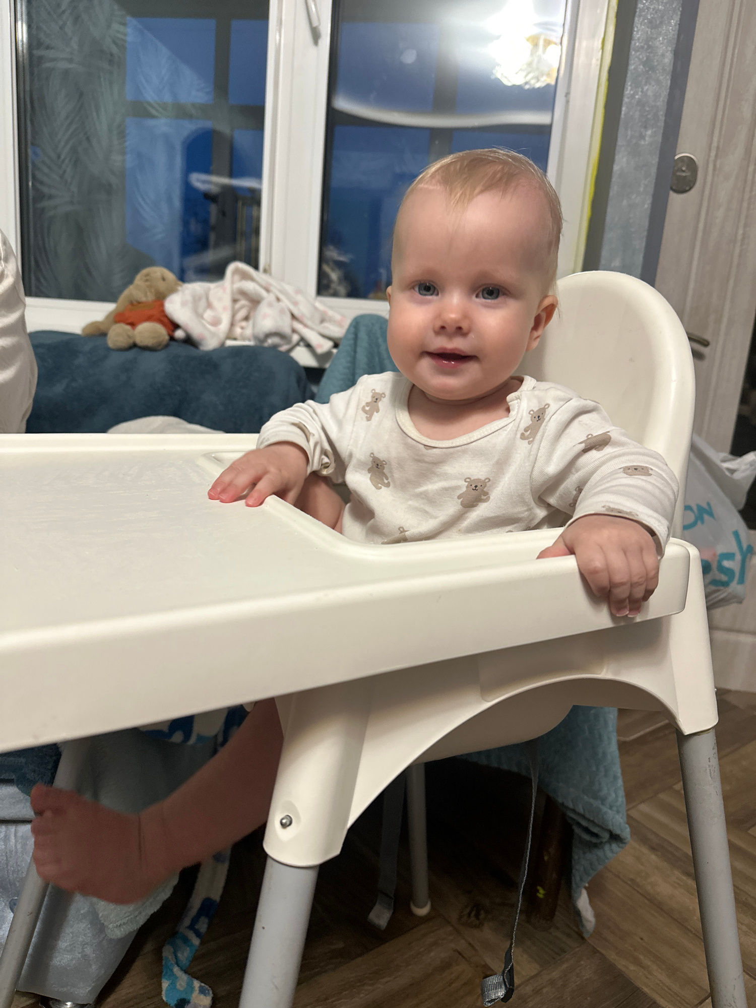 A baby is seated in a white high chair. The baby is wearing a long-sleeved white shirt with a teddy bear pattern. The high chair is placed near a window with frost patterns, and a brown stuffed bear s…read more