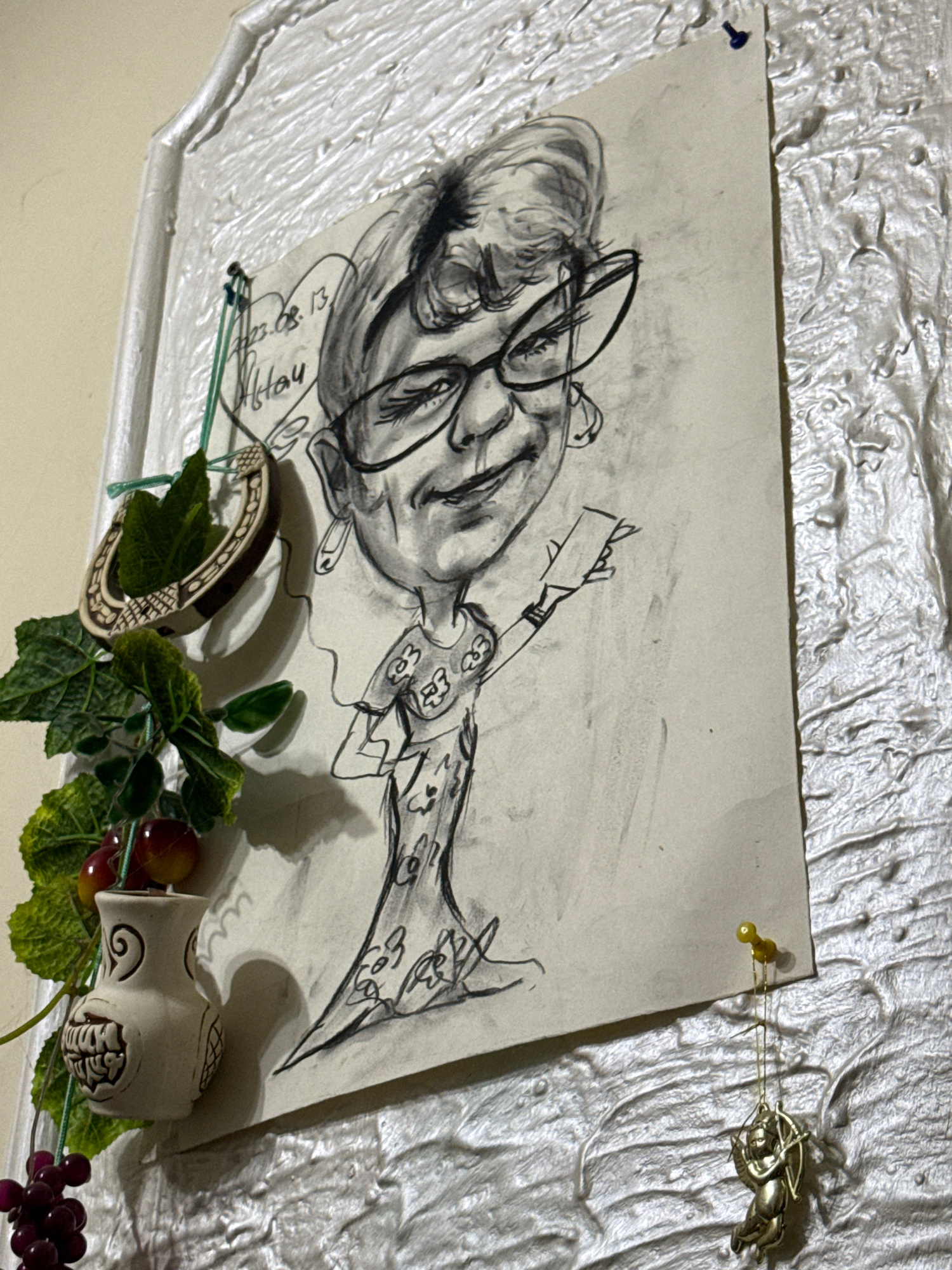 The image presents a close-up of a charcoal or pencil drawing displayed on a textured, silvery-white surface, possibly a decorative wall panel, in Aksay, Kazakhstan. The drawing depicts a caricature o…read more
