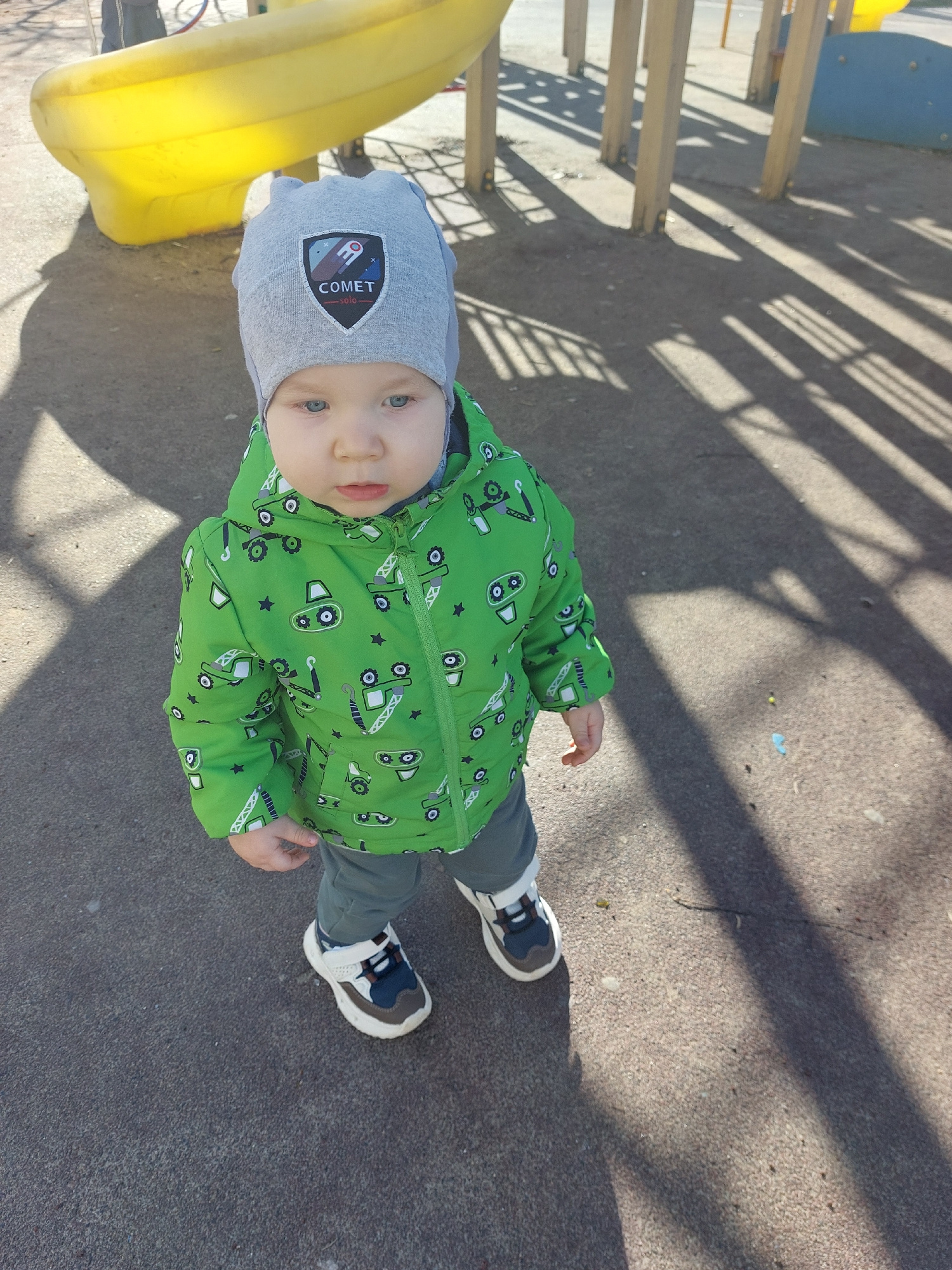 The image features a young child, likely a toddler, standing on a paved surface at an outdoor playground in Chaikovsky, Russia. The child is looking directly at the camera with wide blue eyes and a ne…read more
