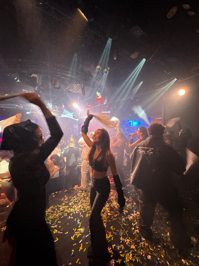 A vibrant nightclub scene is captured with spotlight beams cutting through a smoky atmosphere. A woman in a sequined crop top and pants, wearing gloves, smiles and waves a white fabric in one hand. Co…read more