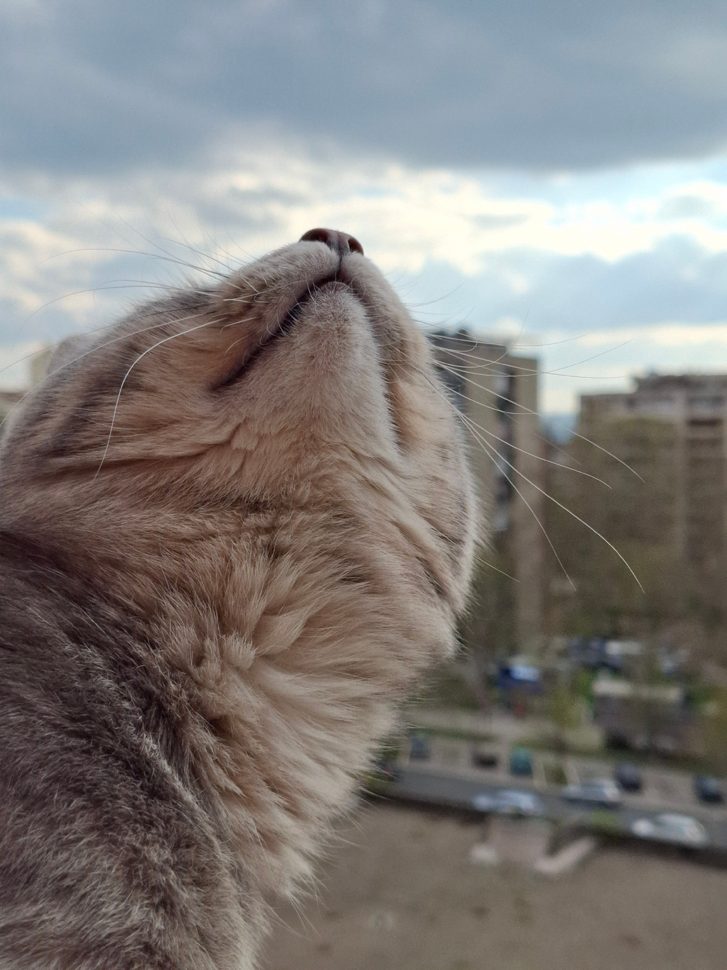 A close-up, low-angle shot of the head and neck of a cat, possibly a grey tabby, is centered in the frame. The cat's eyes are closed and its nose is prominent, pointing upwards towards a cloudy, light…read more