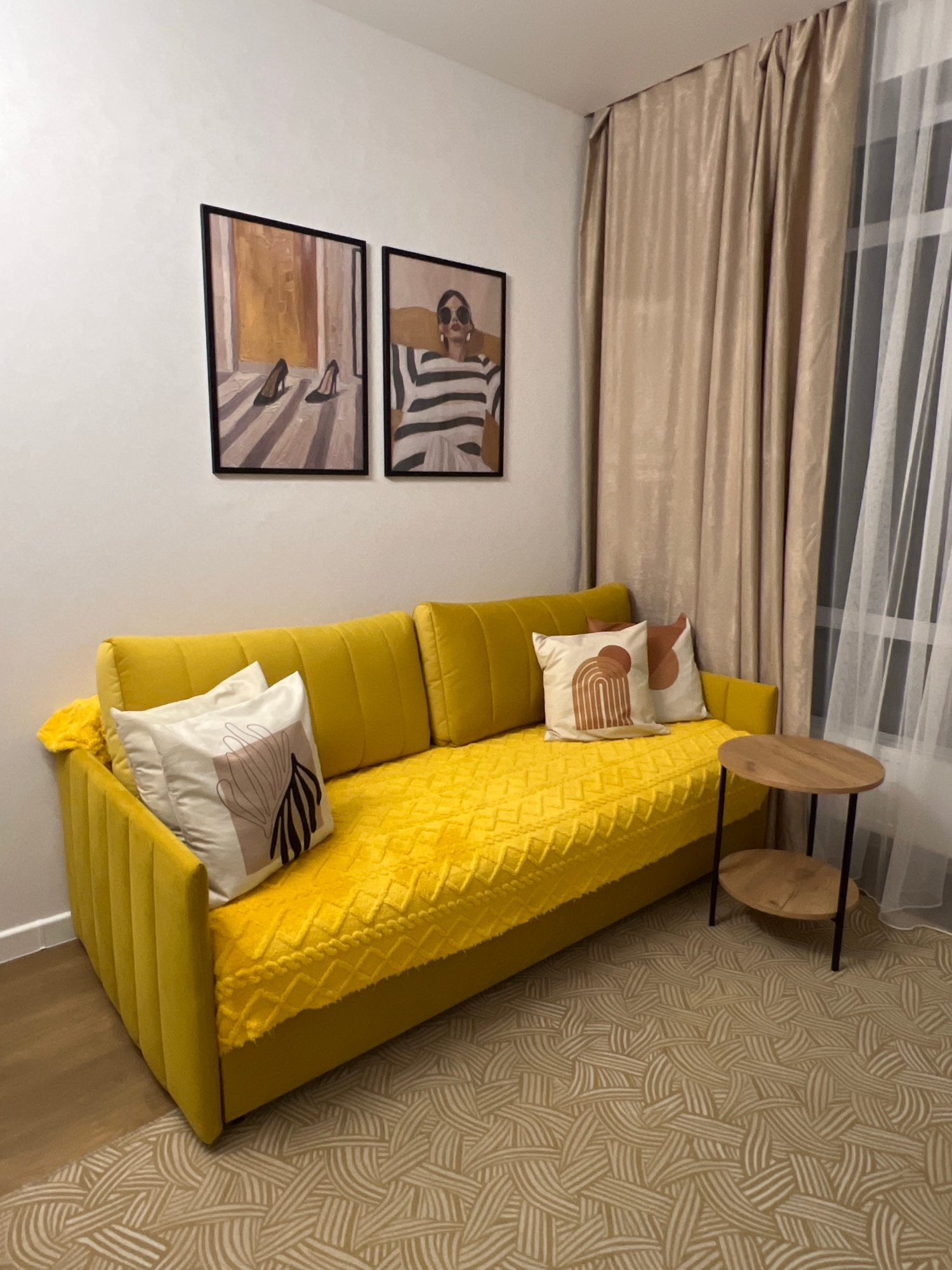 A photograph taken indoors depicts a portion of a room's interior, likely in Perm, Russia, given the prompt's context. A yellow sofa with decorative pillows dominates the scene, positioned against a w…read more