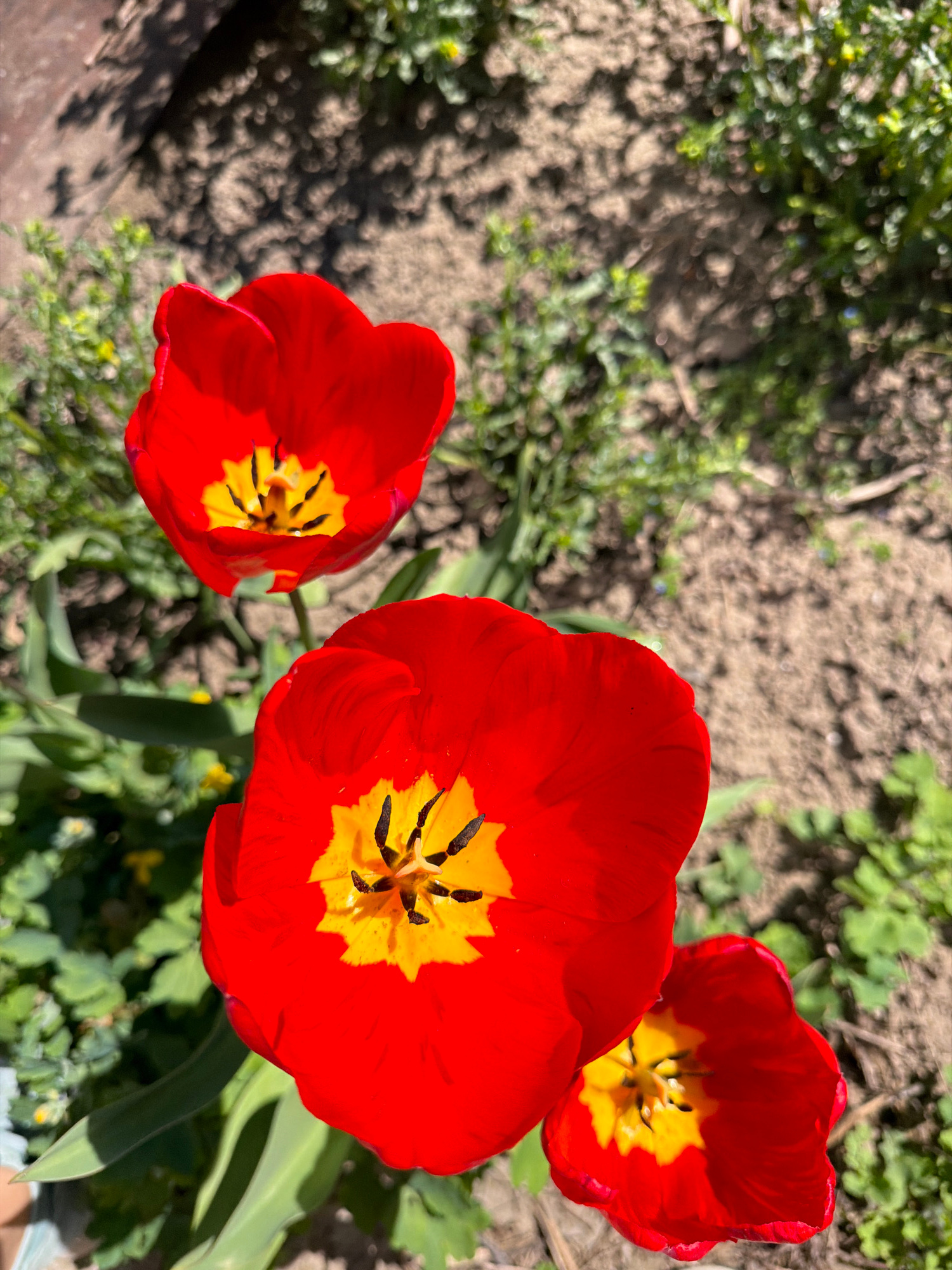 The image shows three red and yellow tulips in a garden in Ravno Pole, Bulgaria. The tulips are in full bloom, with their petals fully open and their yellow centers clearly visible. The background isβ¦read more
