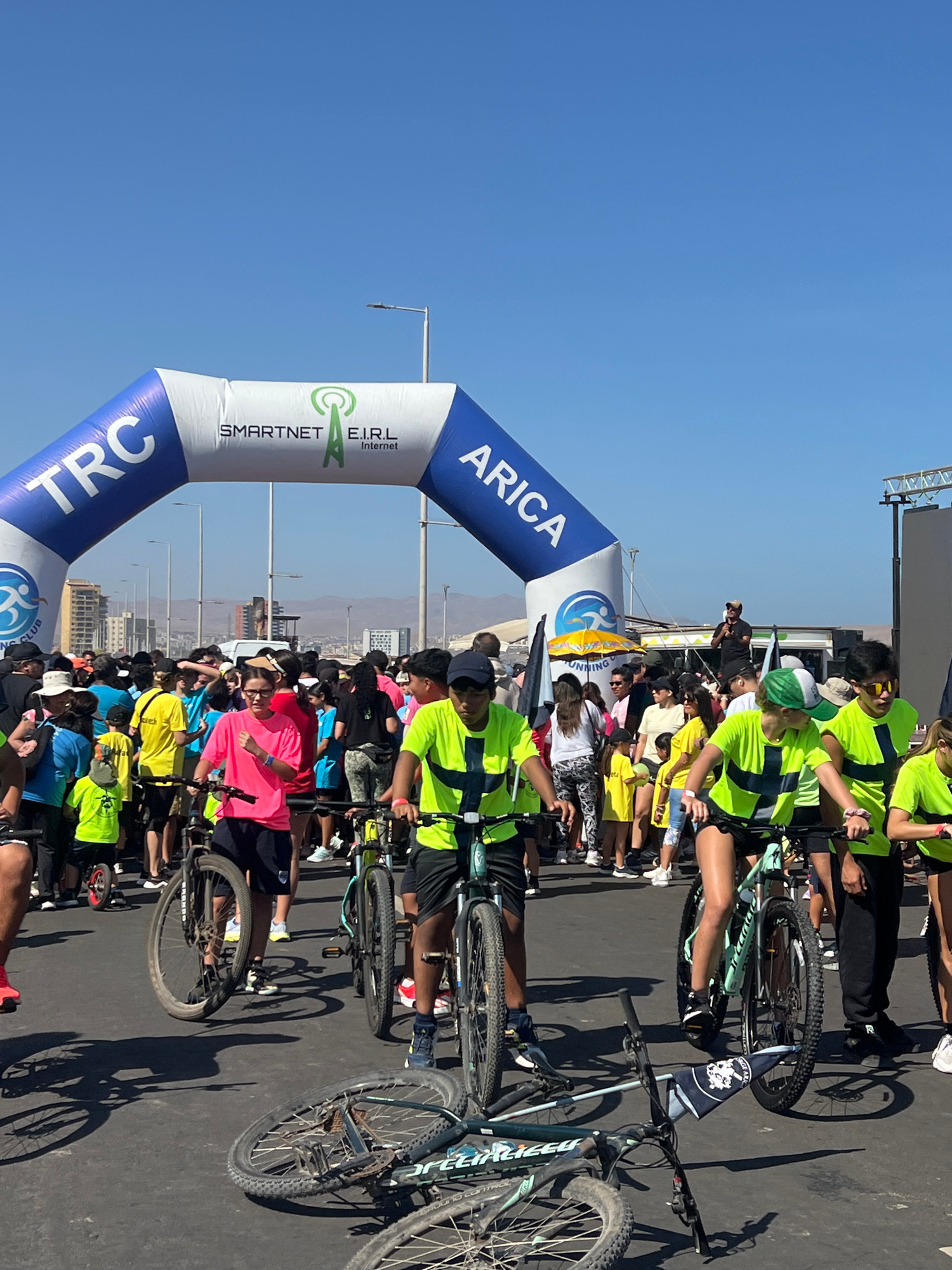 The image shows a cycling event in Arica, Chile. A large inflatable archway with "ARICA" and "SMARTNET E.I.R.L Internet" is visible at the starting point. Numerous cyclists, wearing various colored sh…read more