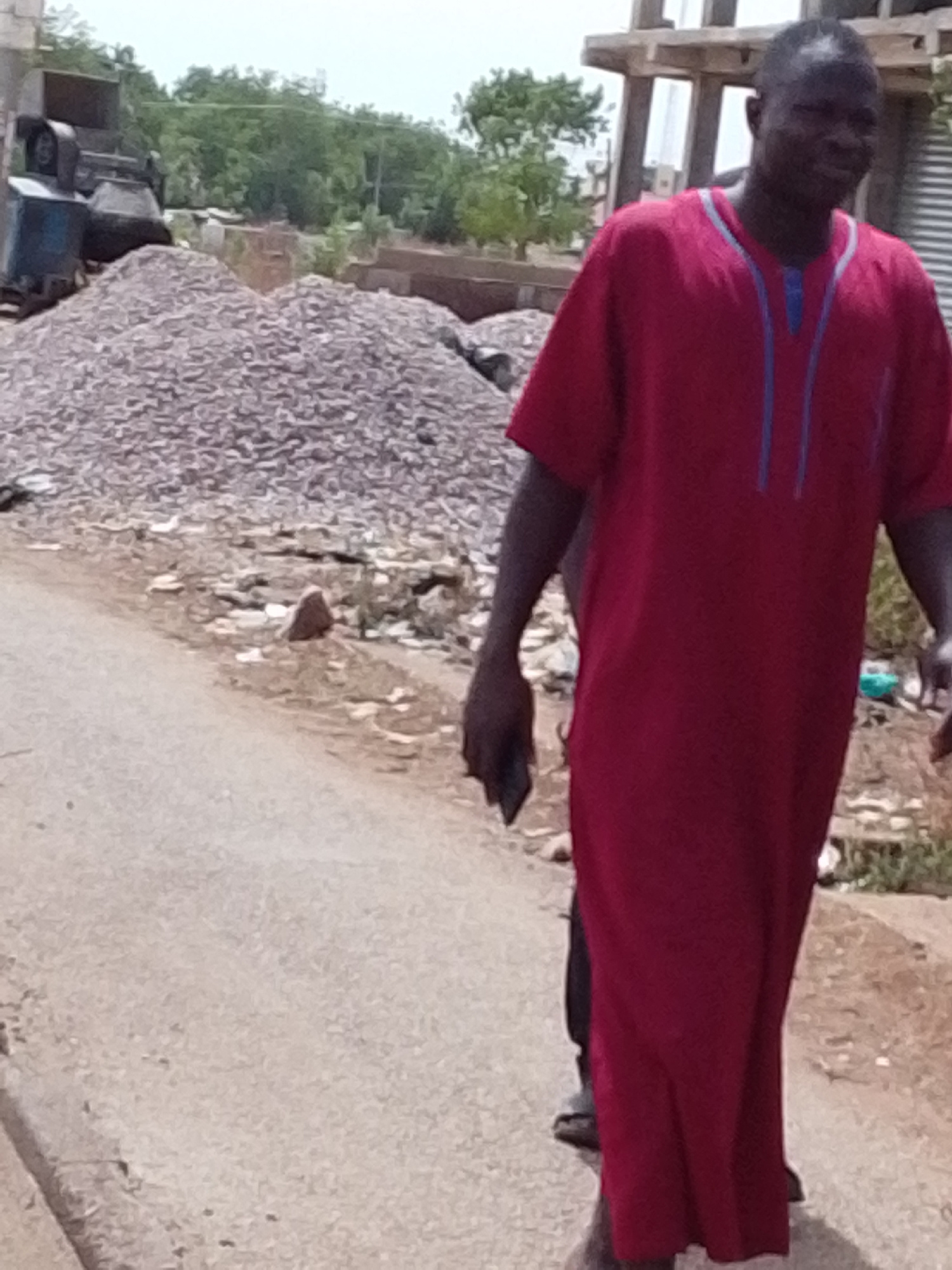 In Tamale, Ghana, a man is walking on a cracked asphalt road, adjacent to a large pile of gravel. He is wearing a long, maroon garment with blue trim around the neck. He is carrying a dark object, pos…read more