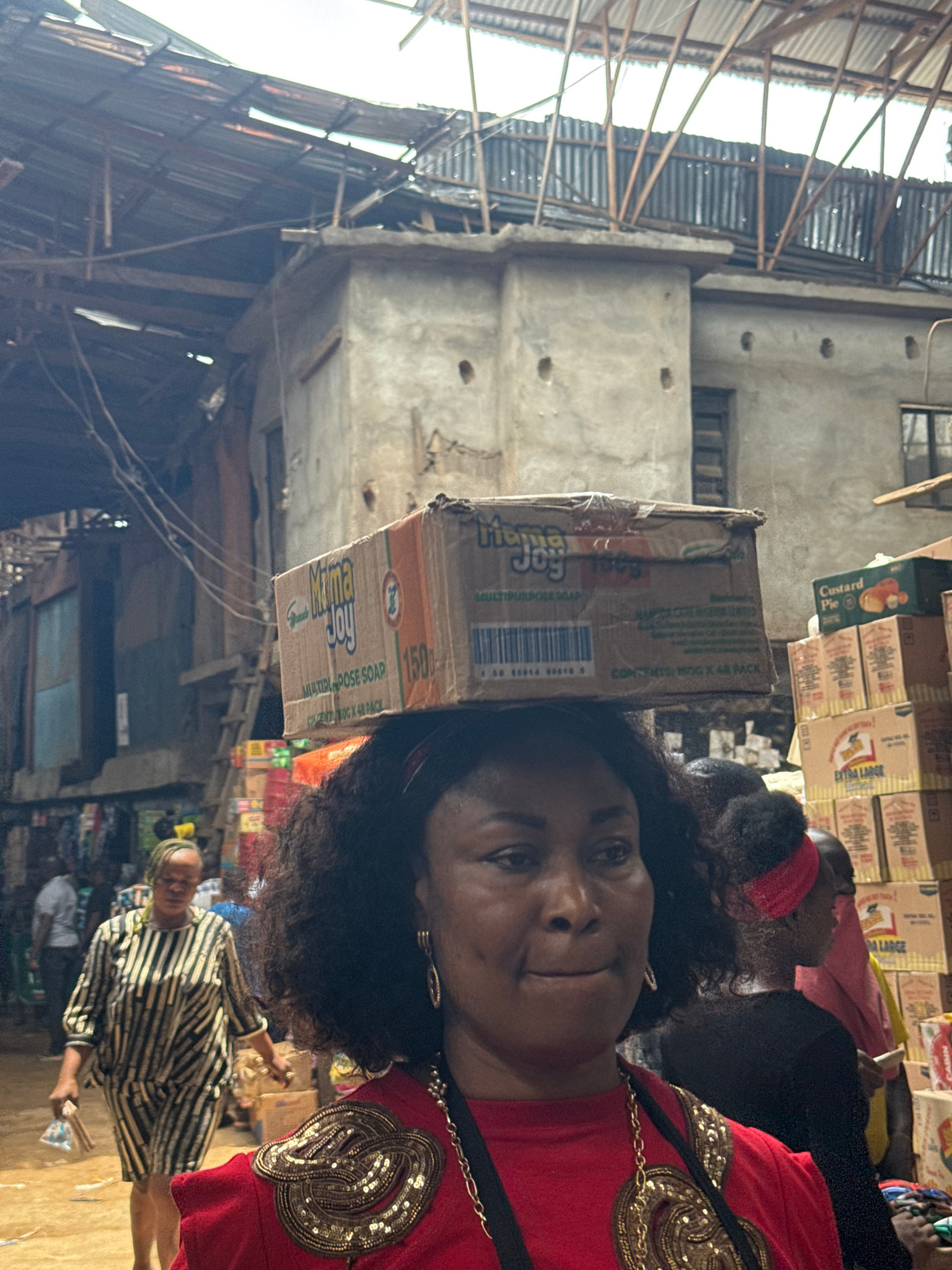 The image depicts a woman wearing a red shirt with gold embellishments, partially obscured by a cardboard box labeled "Ijema Joy MULTIPURPOSE SOAP 1500." Another woman is seen in the background wearin…read more