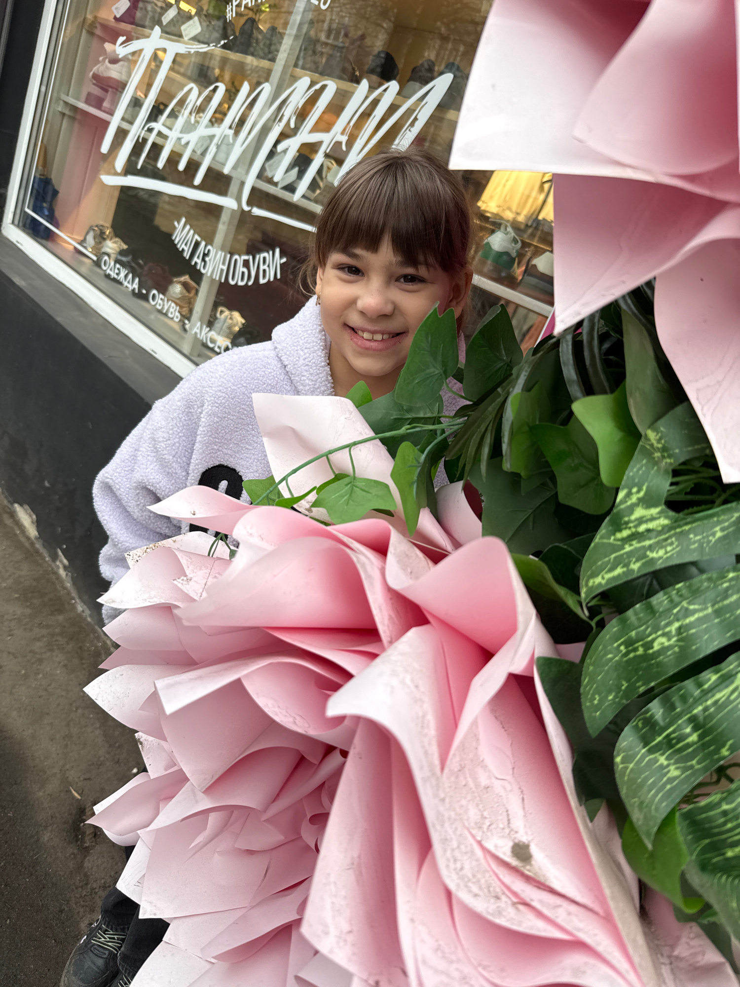 A young girl with brown hair and bangs smiles from behind a large bouquet of pink paper flowers and green artificial foliage. She wears a light purple hooded jacket with a small black and white animal…read more