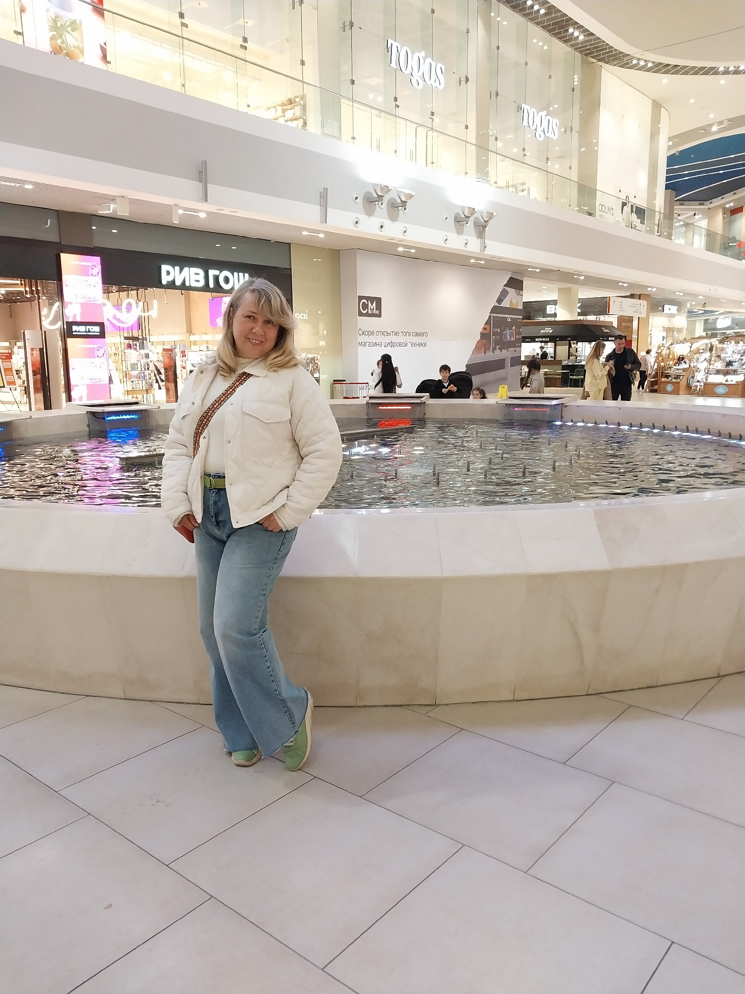 A woman is posing in front of a fountain in a shopping mall. The fountain is a long, narrow structure with water flowing down its sides. The mall has glass walls and multiple levels, with various stor…read more
