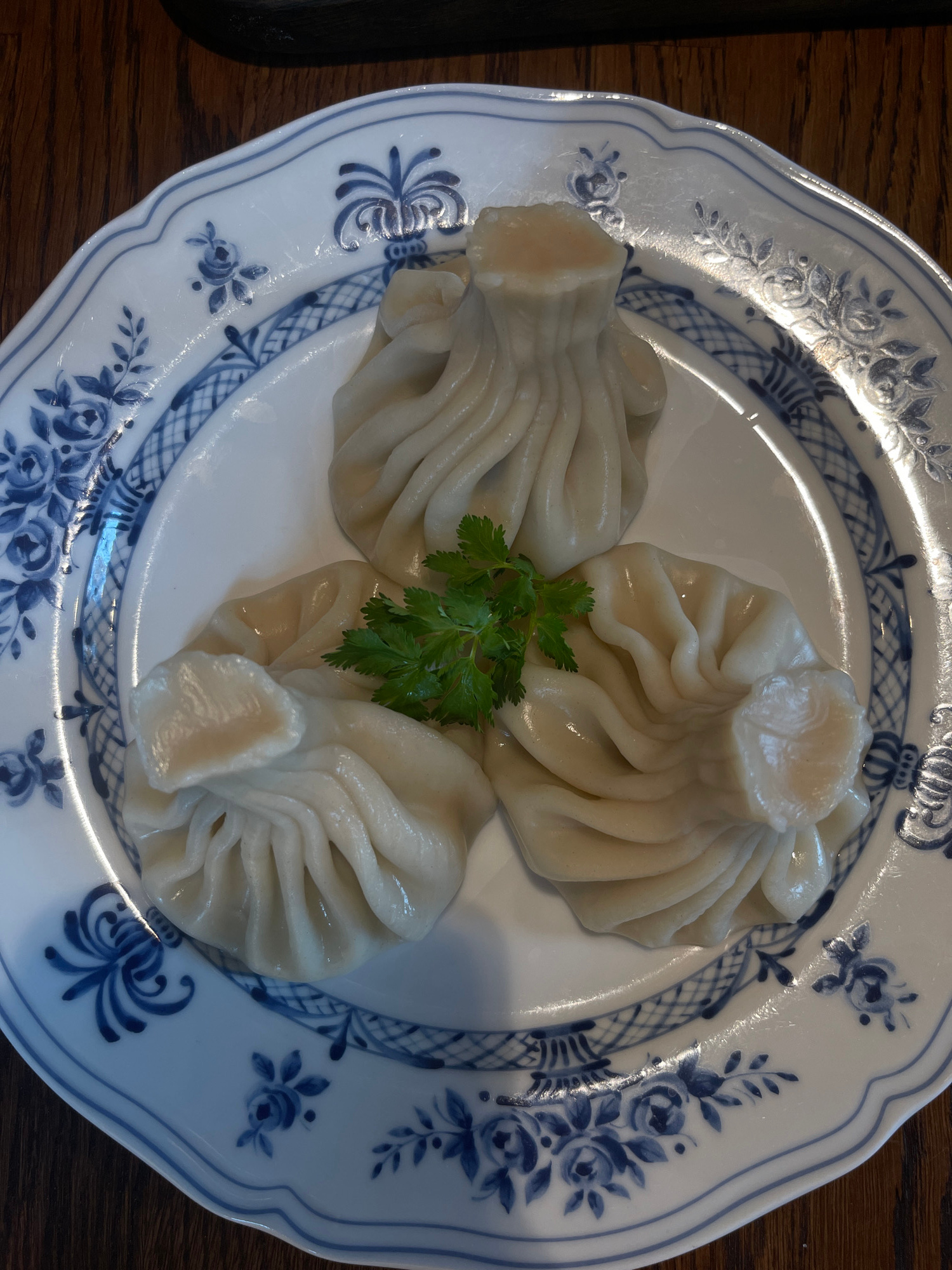The image shows a plate of three dumplings, likely Khinkali, a type of Georgian dumpling, arranged on a white plate with a blue floral pattern. A small sprig of green herbs, likely parsley or cilantro…read more