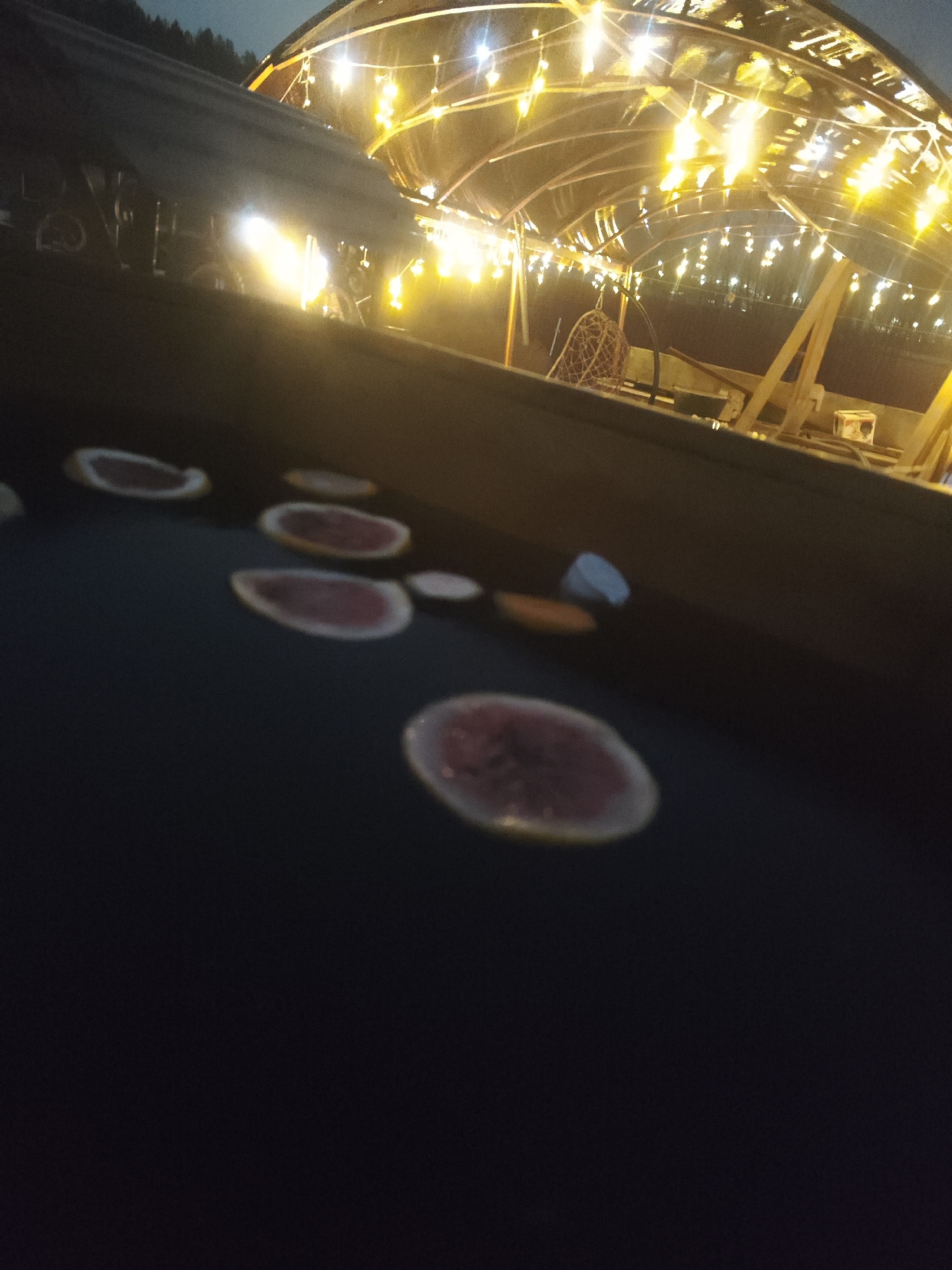 The image captures a nighttime scene, likely in the city of Chaikovsky, Russia, featuring a dark, reflective surface (possibly water) with several round, sliced fruits floating on it. The fruits appea…read more