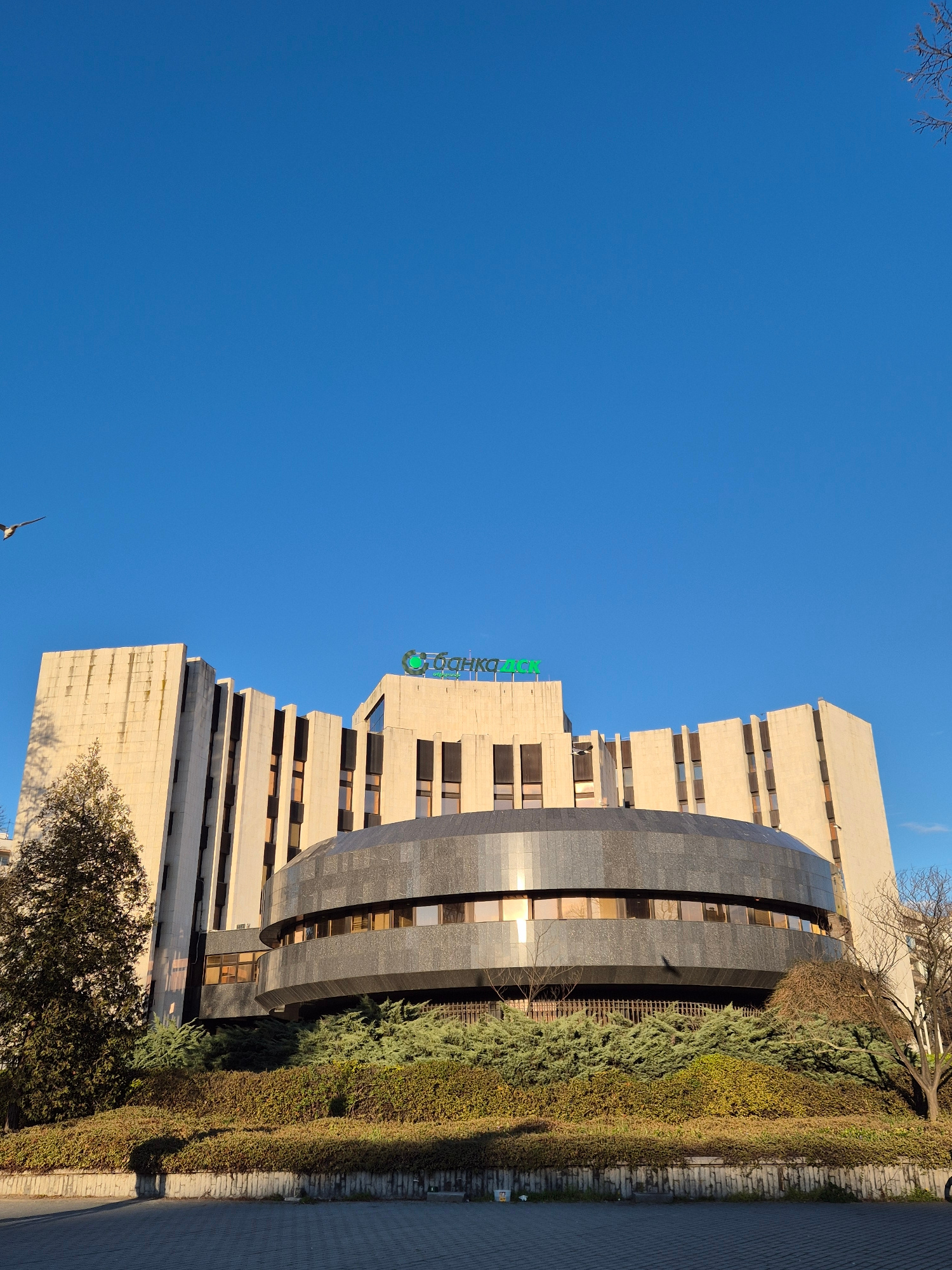 The image depicts the headquarters of the D Commerce Bank in Varna, Bulgaria. The modern building features a light-colored, tiered structure with a prominent curved, dark-grey section. A green sign wi…read more