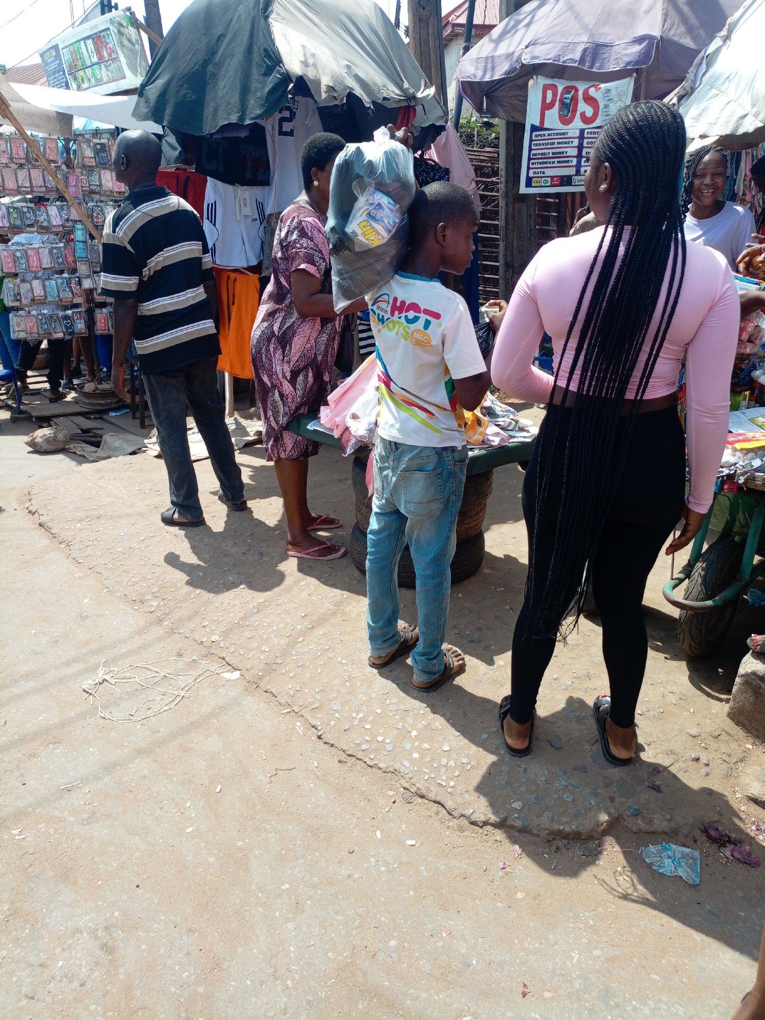 This daylight image captures a vibrant outdoor market scene in Onitsha, Nigeria, under bright sunlight that casts distinct shadows on the ground. Several individuals are present, engaging in various m…read more