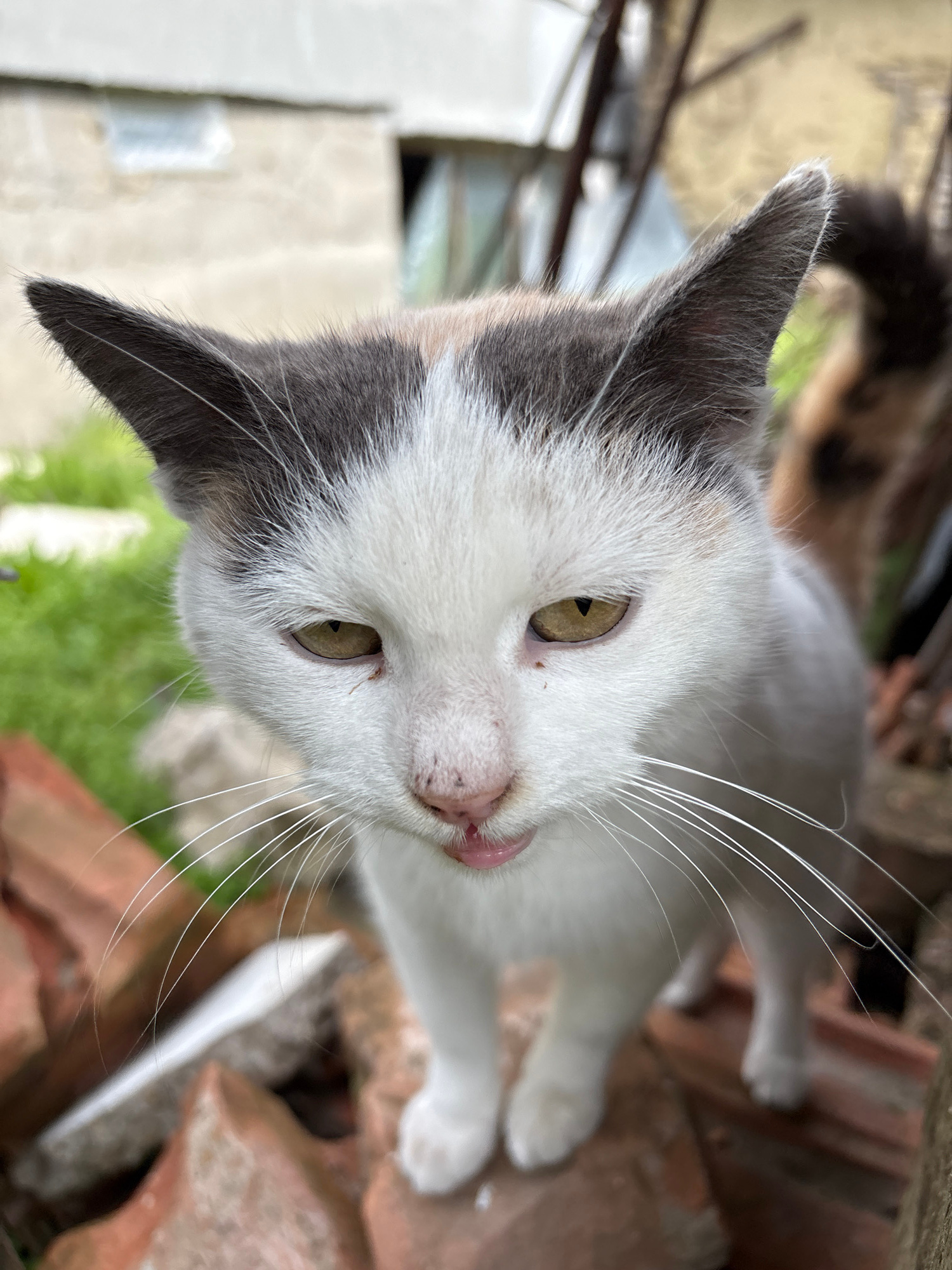 A tilted, close-up, high-angle shot shows a cat with white fur and gray markings on its head, including its ears. The cat has yellow-green eyes and a pink nose with a small amount of pink tongue visib…read more