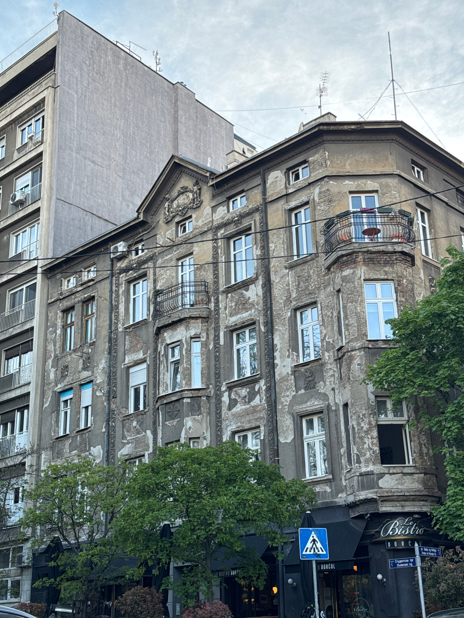 The image depicts a building in Belgrade, Serbia, located at the intersection of Visnjiceva and Studentski Trg streets. The building's facade is weathered and peeling, revealing layers of plaster andβ¦read more