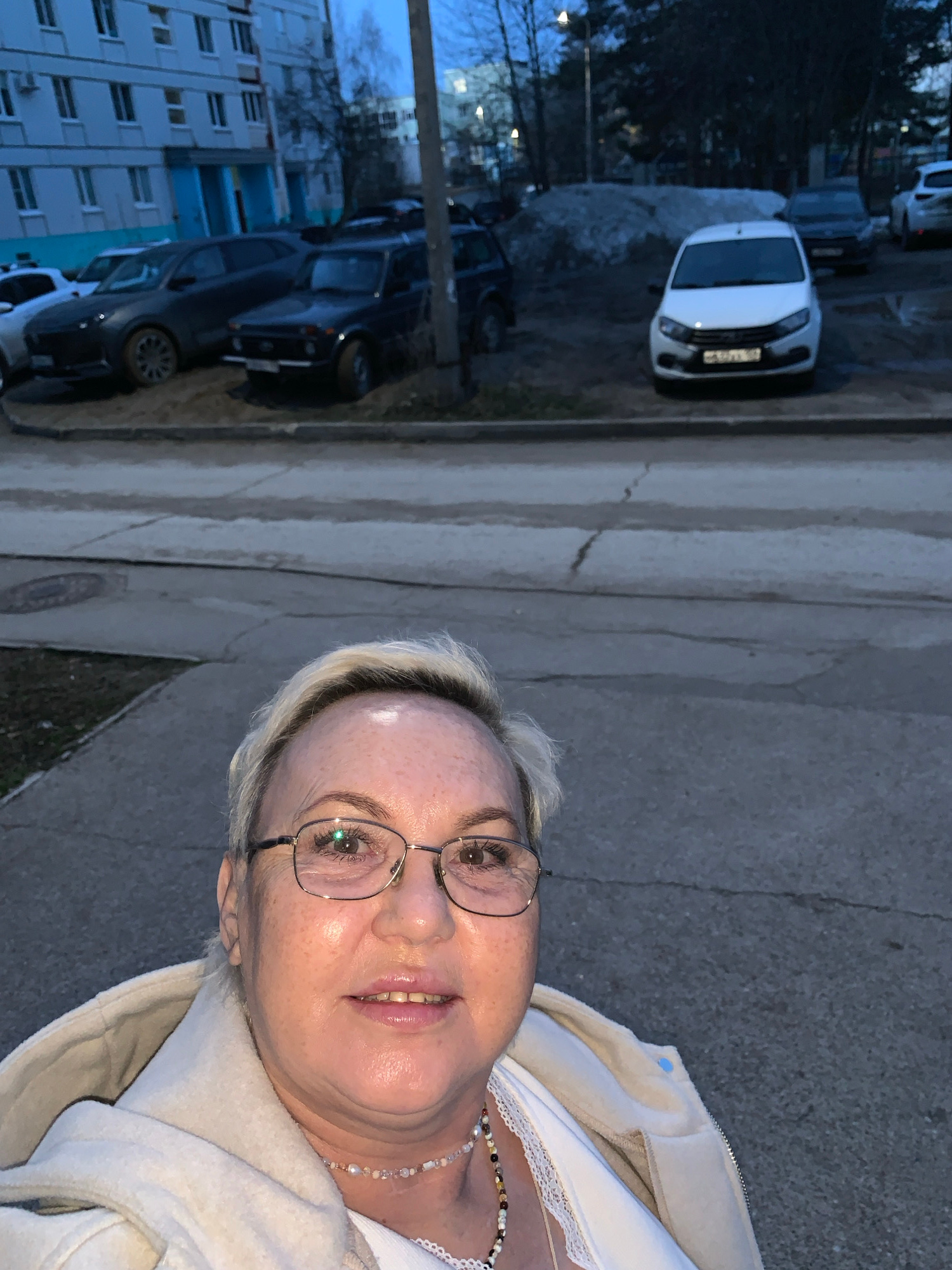The image is a vertical selfie of an adult woman taken outdoors in Chaikovsky, Russia, during twilight hours. The woman, positioned in the right foreground, has short, light blonde hair and wears glas…read more
