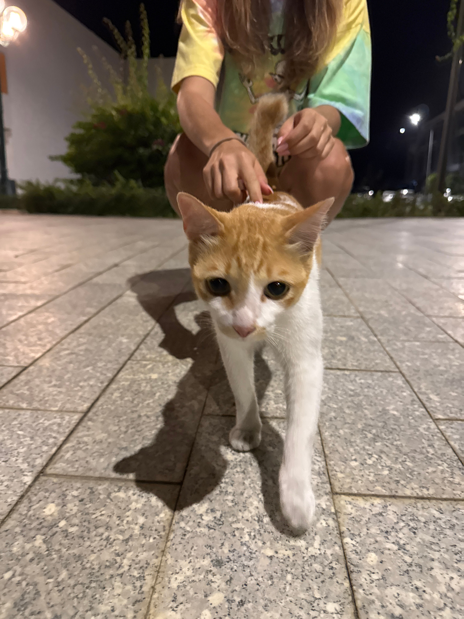 A medium shot shows a cat being petted outdoors in the evening. The cat is mostly white with patches of orange fur on its head. It stretches out one front paw toward the viewer. A person in a colorful…read more