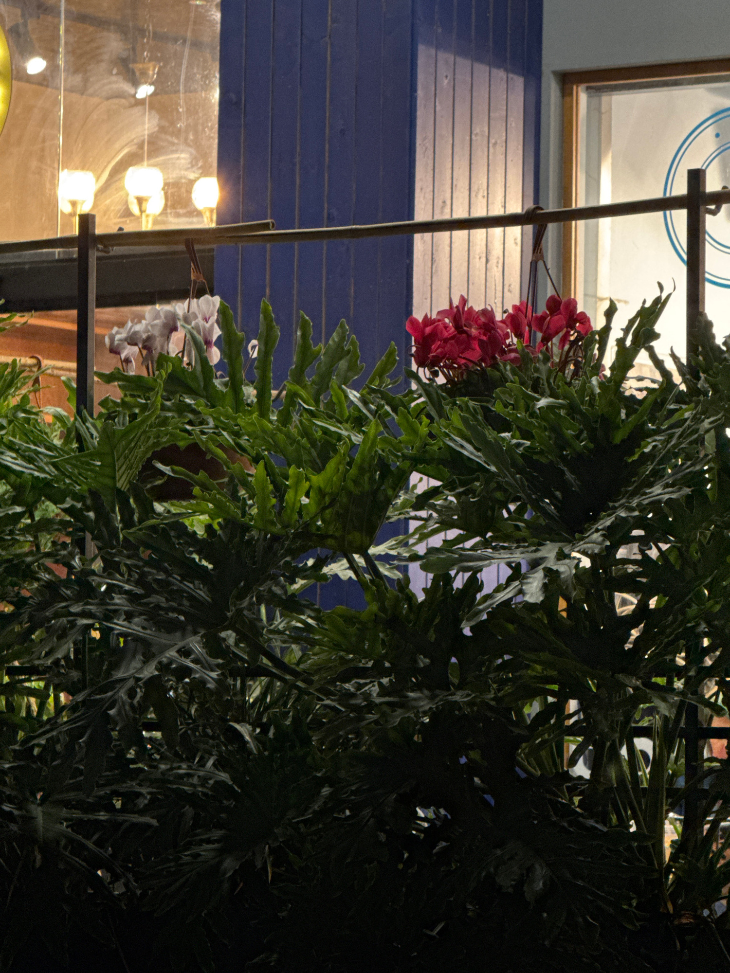 The image shows an outdoor setting in Ramat Gan, Israel. The view is partially obstructed by a large plant with deeply lobed, green leaves. Clusters of red and white flowers are visible among the foli…read more