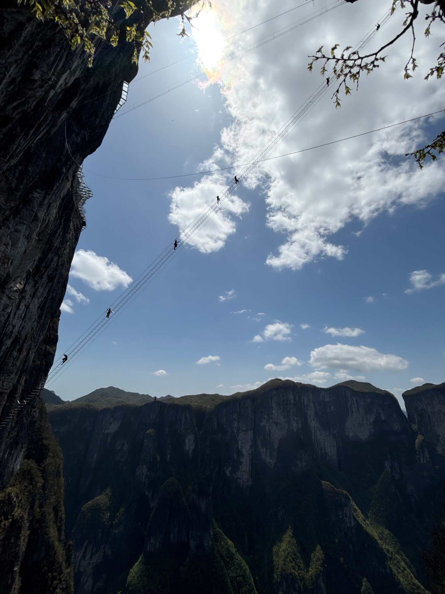 The image depicts a high-altitude zipline attraction in Yongding District, China. The sky is partly cloudy with a bright sun positioned on the left side, creating glare. A series of zipline cables are…read more