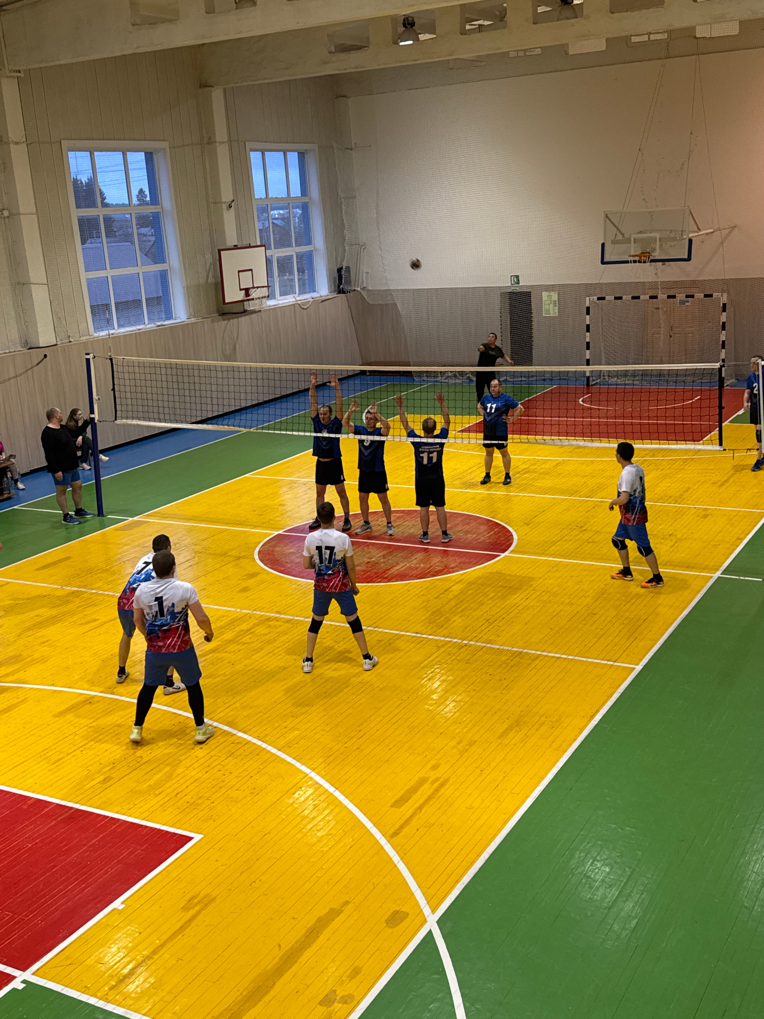An overhead shot captures an active volleyball game or practice inside an indoor sports hall in Oktyabrsky, Russia. The vibrant court features distinct sections: a large yellow area, a green section,…read more