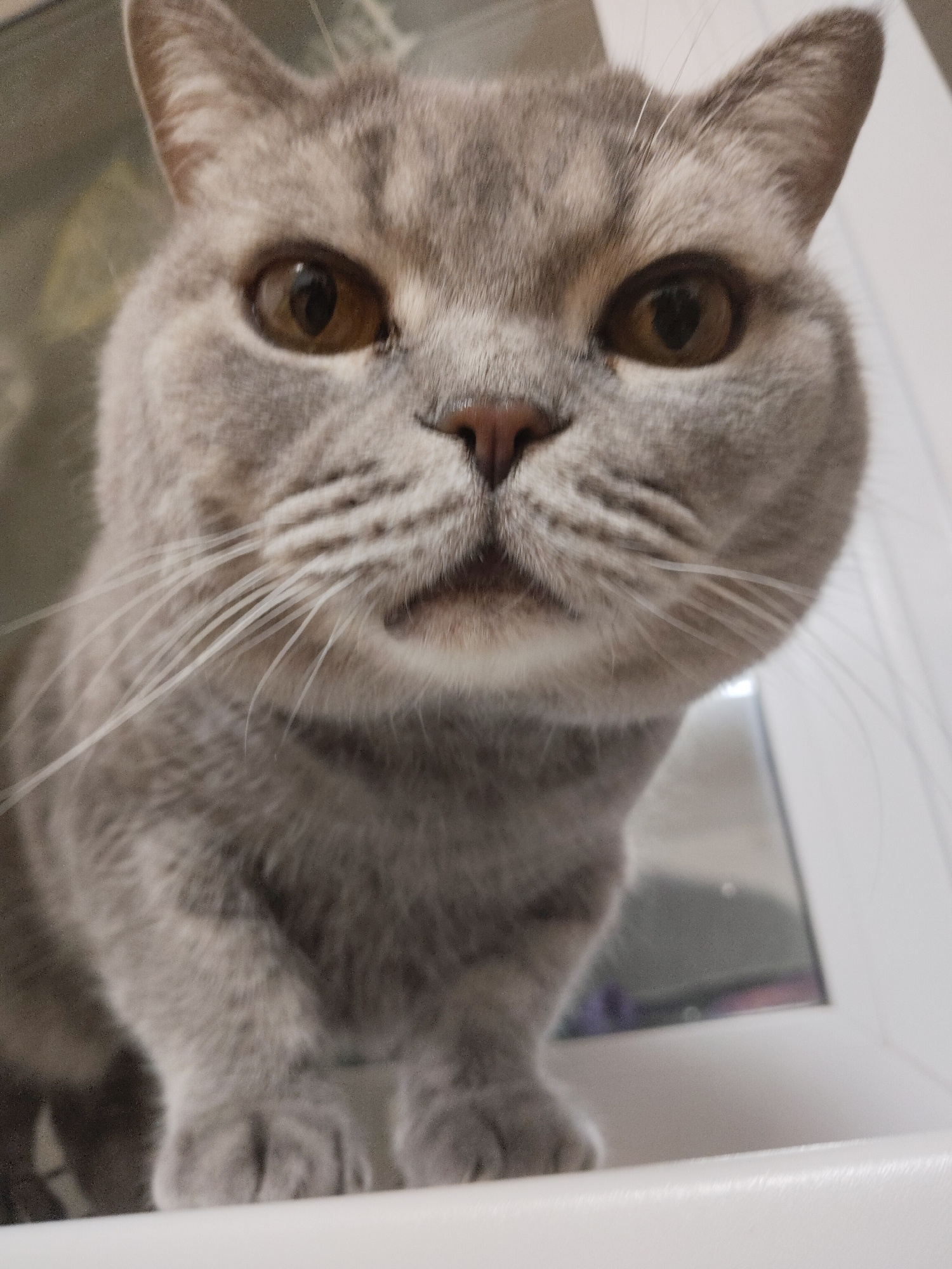 A grey, short-haired cat with amber eyes looks directly into the camera. The cat's face is mostly in focus, with some blurriness towards the bottom and edges of the frame. The cat is positioned above…read more